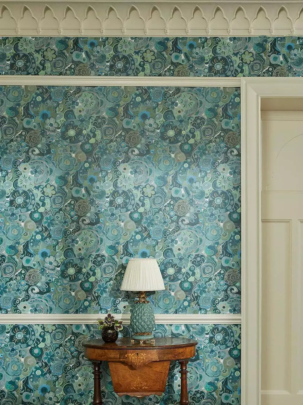 Diese außergewöhnliche Tapete in Blau und Grün ist ideal, um Räume aufzuwerten, ohne sie zu überladen. Ob als Highlight an einer Akzentwand oder um eine gemütliche, stimmungsvolle Atmosphäre zu schaffen – dieses Design fesselt den Blick und lädt zum Verweilen ein. Perfekt für mutige Einrichtungsideen und stilvolle Arrangements, bei denen Persönlichkeit im Vordergrund steht.