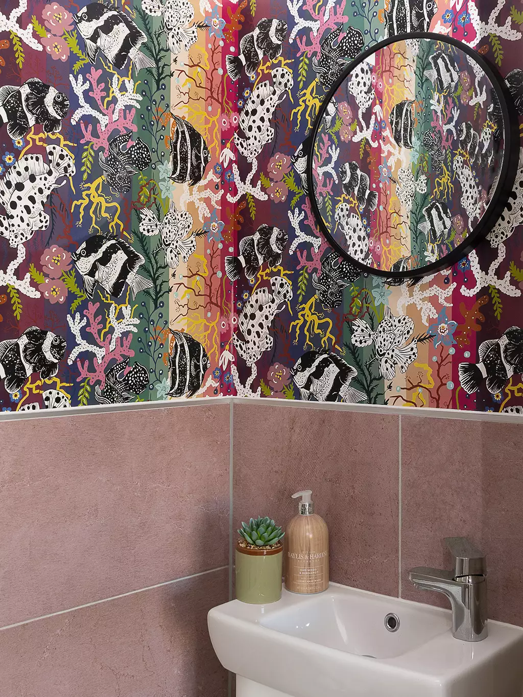Neptun-Tapete in Aquamarine. Neptun hat seinen Namen vom römischen Gott des Meeres und ist ein fröhlicher „Unterwasser“-Druck, der eines der Weltwunder zeigt, das große Barriereriff. Neptun zeigt bunte Korallen, Algen und wunderschöne schwarz-weiße Fische. Dieses Wunder wurde mit Regenbogenfarben kombiniert, um das ultimative Statement-Papier zu kreieren.