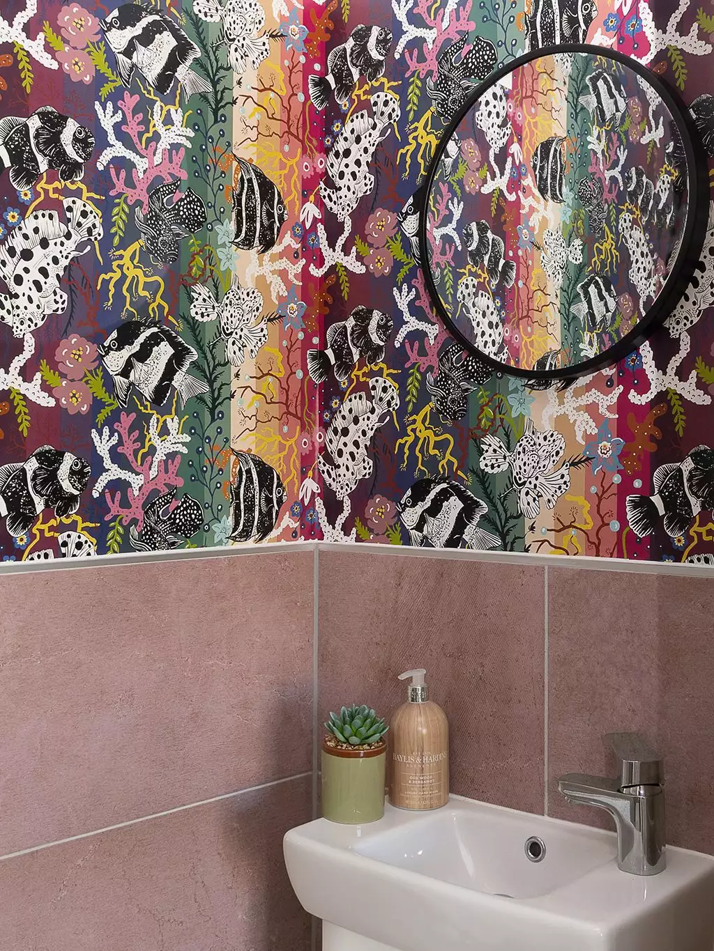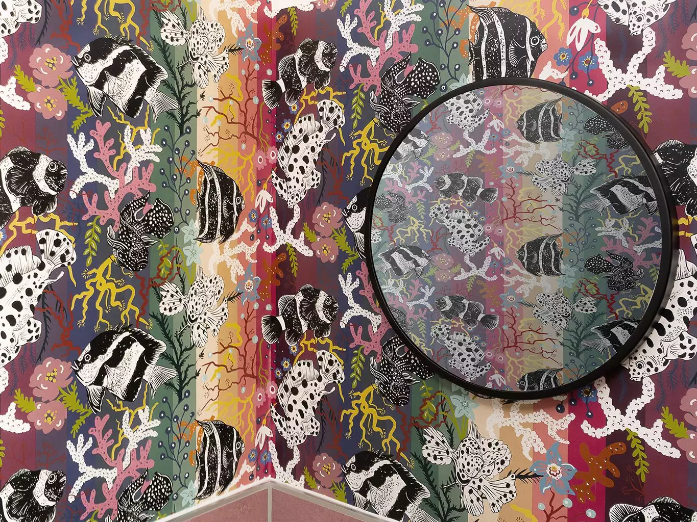 Neptun-Tapete in Aquamarine. Neptun hat seinen Namen vom römischen Gott des Meeres und ist ein fröhlicher „Unterwasser“-Druck, der eines der Weltwunder zeigt, das große Barriereriff. Neptun zeigt bunte Korallen, Algen und wunderschöne schwarz-weiße Fische. Dieses Wunder wurde mit Regenbogenfarben kombiniert, um das ultimative Statement-Papier zu kreieren. Dies ist der perfekte Badezimmerdruck! Kombinieren Sie es mit schwarzen Fliesen und goldenen Oberflächen.