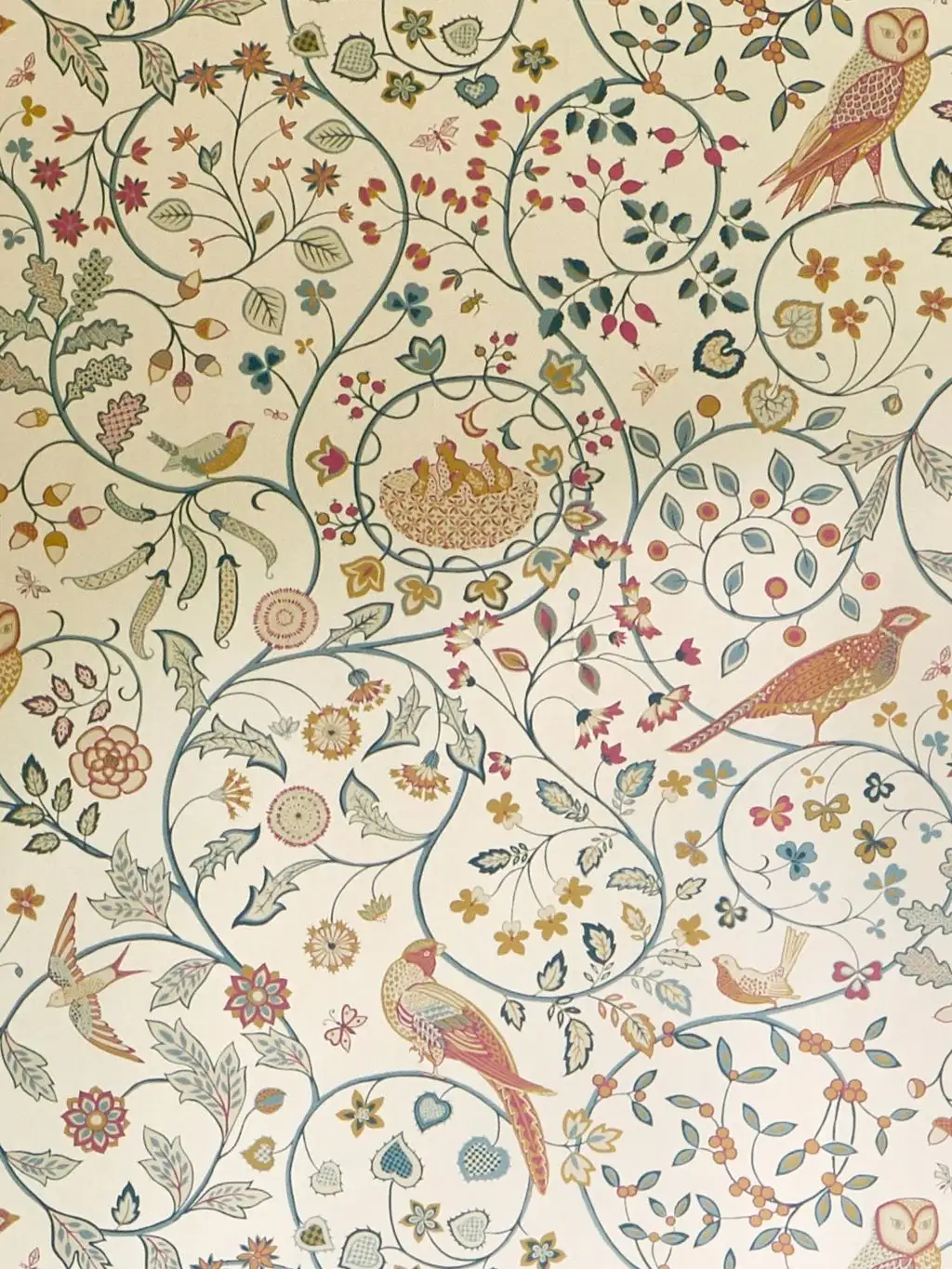 Naturfreunde kommen bei dieser liebevoll gestalteten Tapete von Morris & co. voll auf Ihre Kosten. Verschiedene Blätter, Früchte und Vogelarten bilden das Hauptthema zwischen geschwungenen und verschnörkelten Ranken. Eine ausdrucksvolle Eule fällt besonders ins Auge. Vorlage für dieses wundervolle Motiv war die Stickerei auf einer Bettdecke von 1905. Diese englische Tapete nach historischem Vorbild spiegelt die Liebe der Engländer zu ausgedehnten Spaziergängen in der Natur wider. Auch wir lieben es die Natur in unser Zuhause zu lassen und von ihrer erholsamen und entspannenden Wirkung zu profitieren!