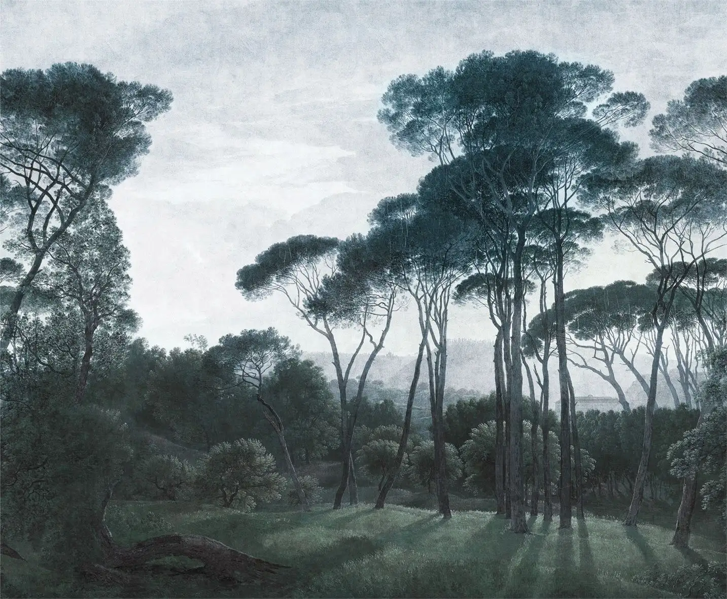 Eine klassische Landschaft aus Hügeln, Kiefern, Büschen. Diese Tapete, die an einen alten Druck oder ein Gemälde aus dem 18. Jahrhundert erinnert, richtet alle Innenräume, auch die kleinsten, ein und gibt ihnen Raum, die Räumlichkeit und Perspektive gewinnen.
