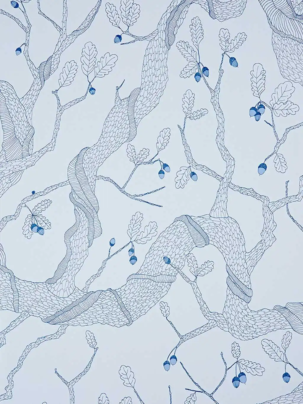 The hand drawn design features a gnarly oak tree with tangled vines growing diagonally up the wall with a few delicate acorns. Legend calls the mighty oak the most powerful of all the trees.