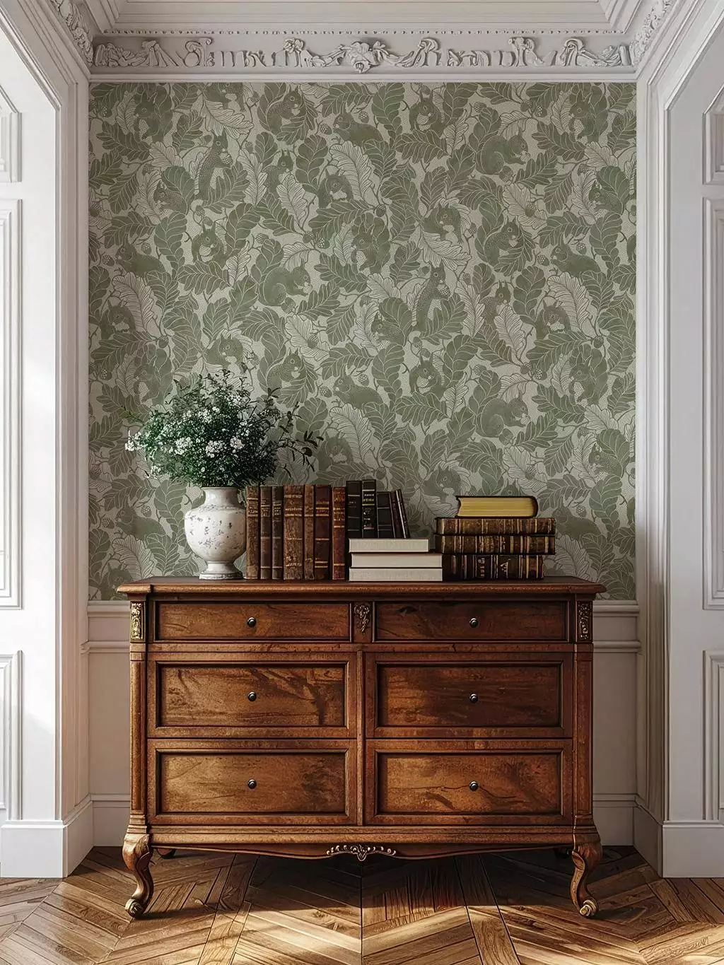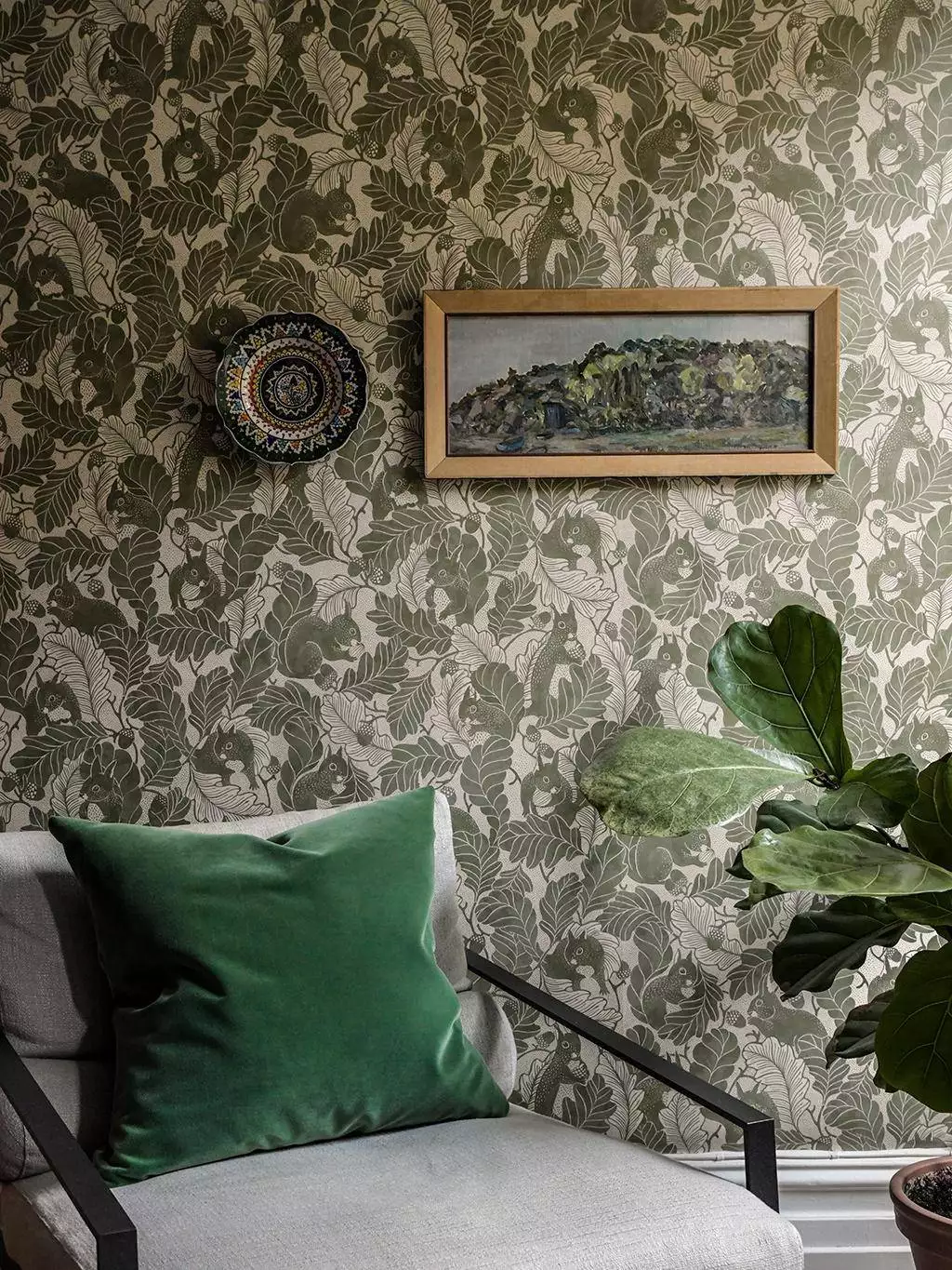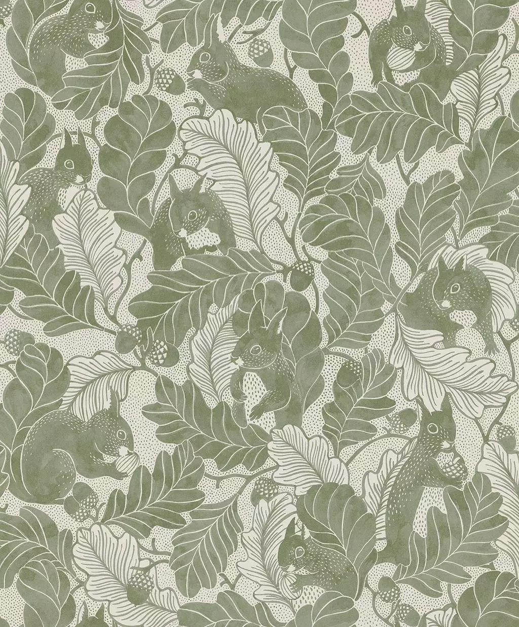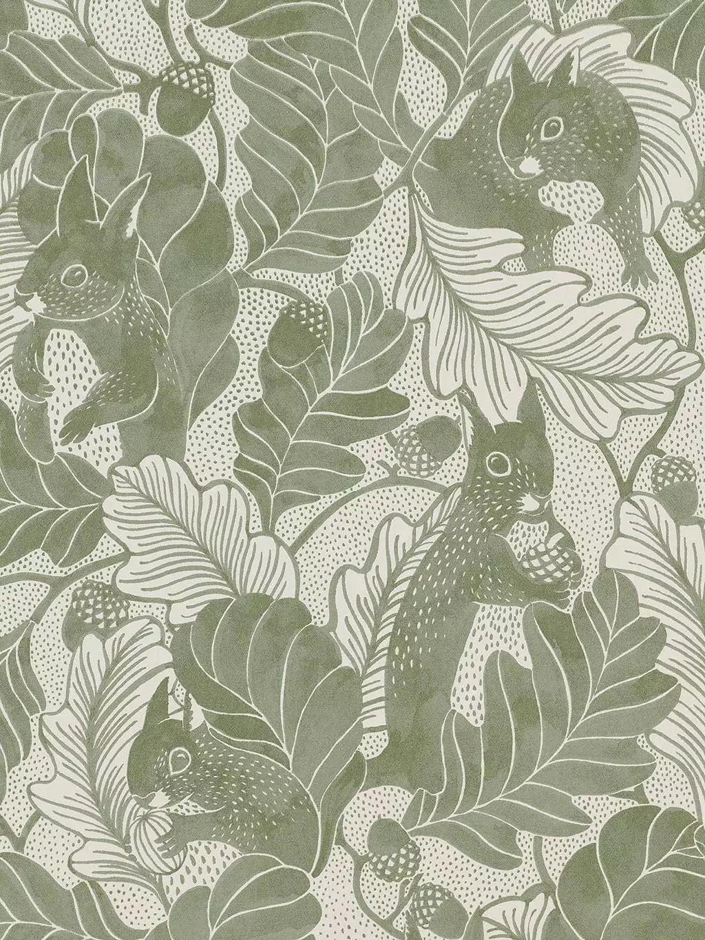 Die Tapete Oak Tree Tails erzählt eine stille Geschichte aus dem Wald. Zwischen fein gezeichneten Eichenblättern tauchen Eichhörnchen auf, als hätten sie sich im Blätterwerk versteckt. Das warme Olive und die sanfte Linienführung verleihen dem Motiv eine ruhige Geborgenheit, die sofort an Landhaus-Atmosphäre denken lässt.