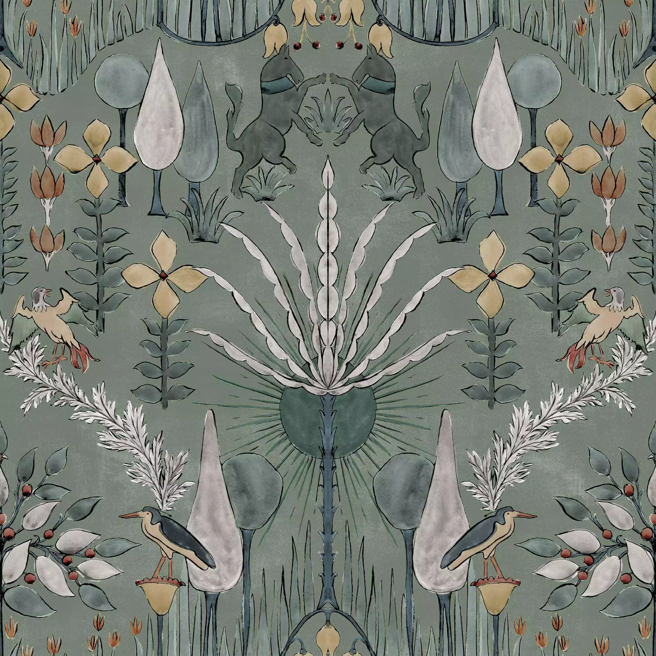 Ein ornamentaler Garten voller Fantasie entfaltet sich auf dieser Tapete: florale Muster, zarte Blüten und stilisierte Bäume verweben sich zu einem harmonischen Rhythmus. Die Farbwelt in sanften Celadon- und Naturtönen schafft Ruhe und Tiefe, während das verspielte Motiv für Leichtigkeit sorgt. Oasis Villa Celadon verbindet kunstvolle Gestaltung mit einer entspannten, modernen Anmutung – ideal für Räume, die Charakter und Gelassenheit zugleich ausstrahlen sollen.
