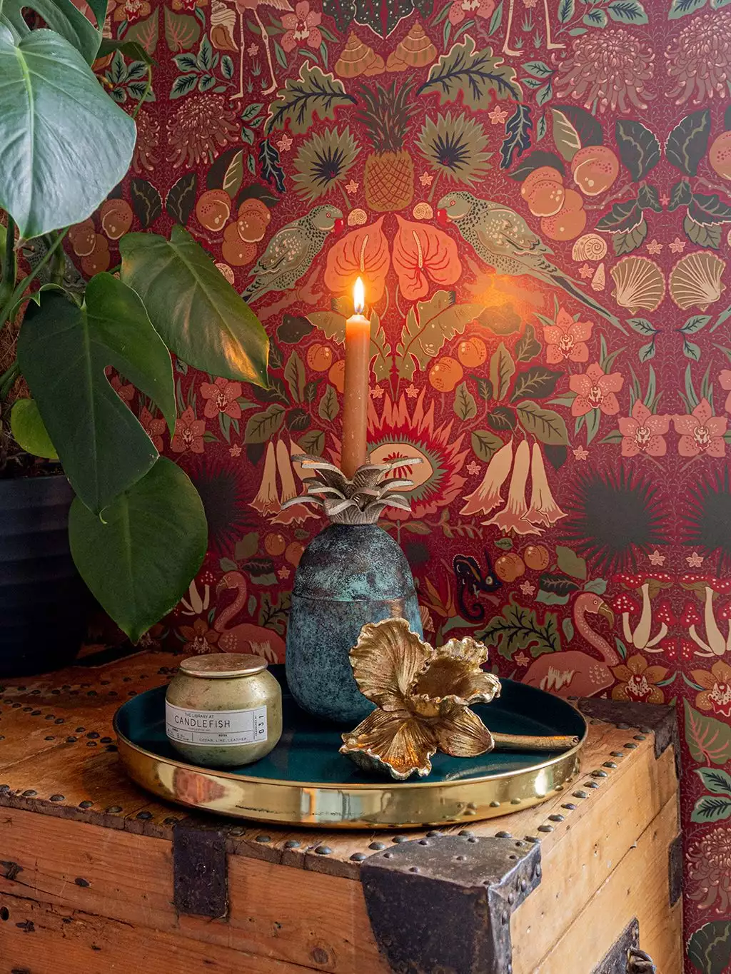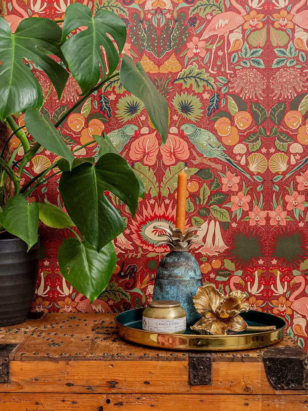Oasis ist unser tropisch inspiriertes Arts-and-Crafts-Design mit den Spiegelungstechniken, die in der Arbeit des legendären Designers William Morris zu sehen sind. Oasis ist genau das: ein wunderschöner Zufluchtsort inmitten der Hektik des Alltags. Sie bietet wunderschöne Paradiesvögel wie Papageien zwischen Ananas, Palmen, Pfirsichen und Proteas! Die Farbgebung Crimson-Red ist ein pompöses Rot.