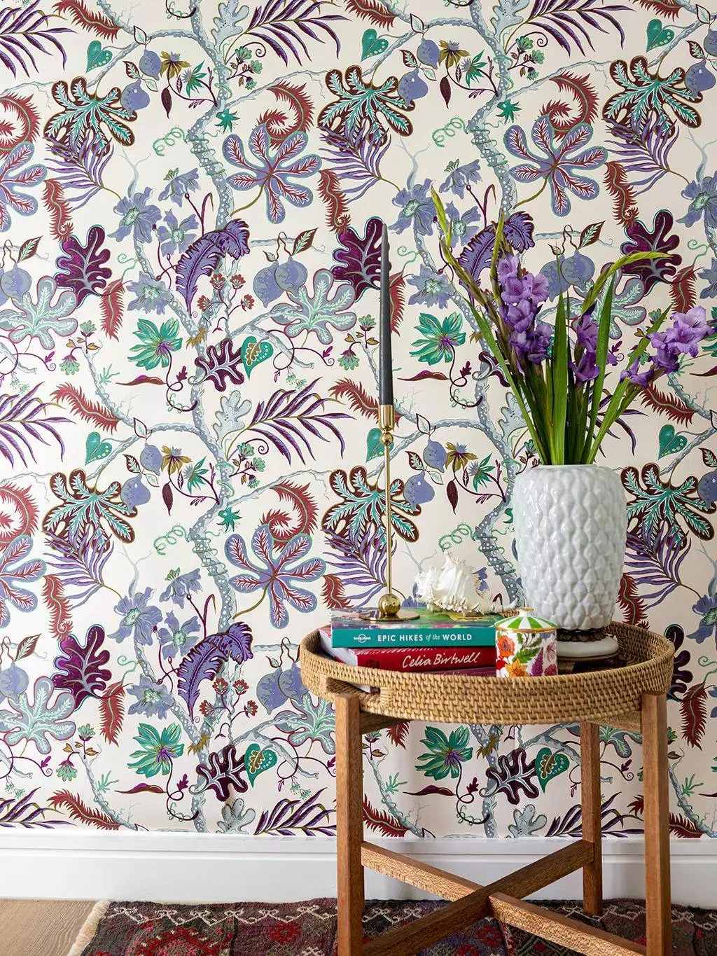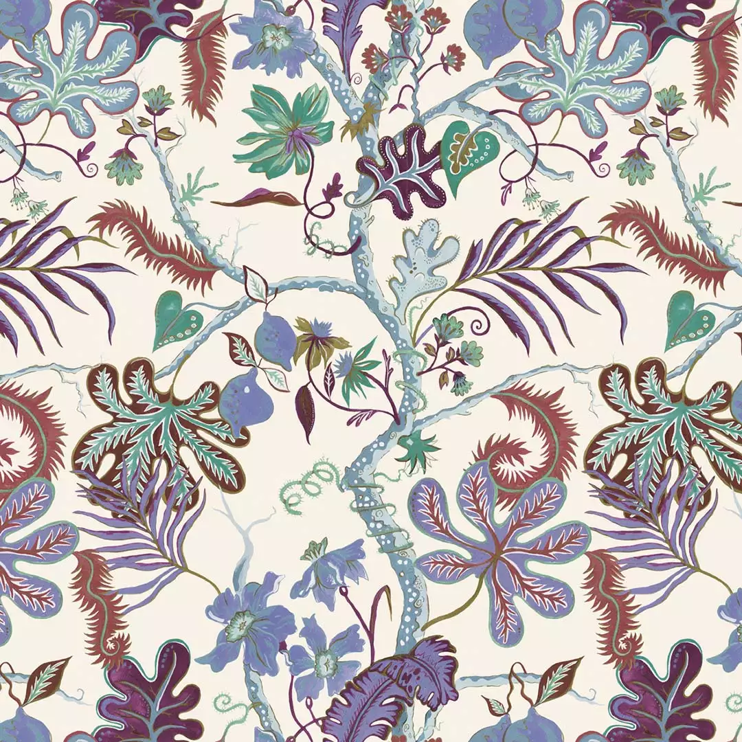 Die Tapete Ophelia, Quartz entfaltet ein opulentes Geflecht aus Blättern, Blüten und Ranken, das in satten Violett-, Grün- und Blautönen auf hellem Grund zur Geltung kommt. Das detailreiche Muster erinnert an klassische Chinoiserien und verbindet exotische Pflanzenmotive mit kunstvoll geschwungenen Linien. Die kräftigen Farben und die feine Ornamentik verleihen der Gestaltung eine ausdrucksstarke Tiefe, die zwischen dekorativer Pracht und künstlerischer Erzählung oszilliert.