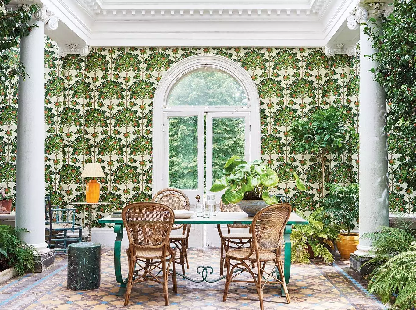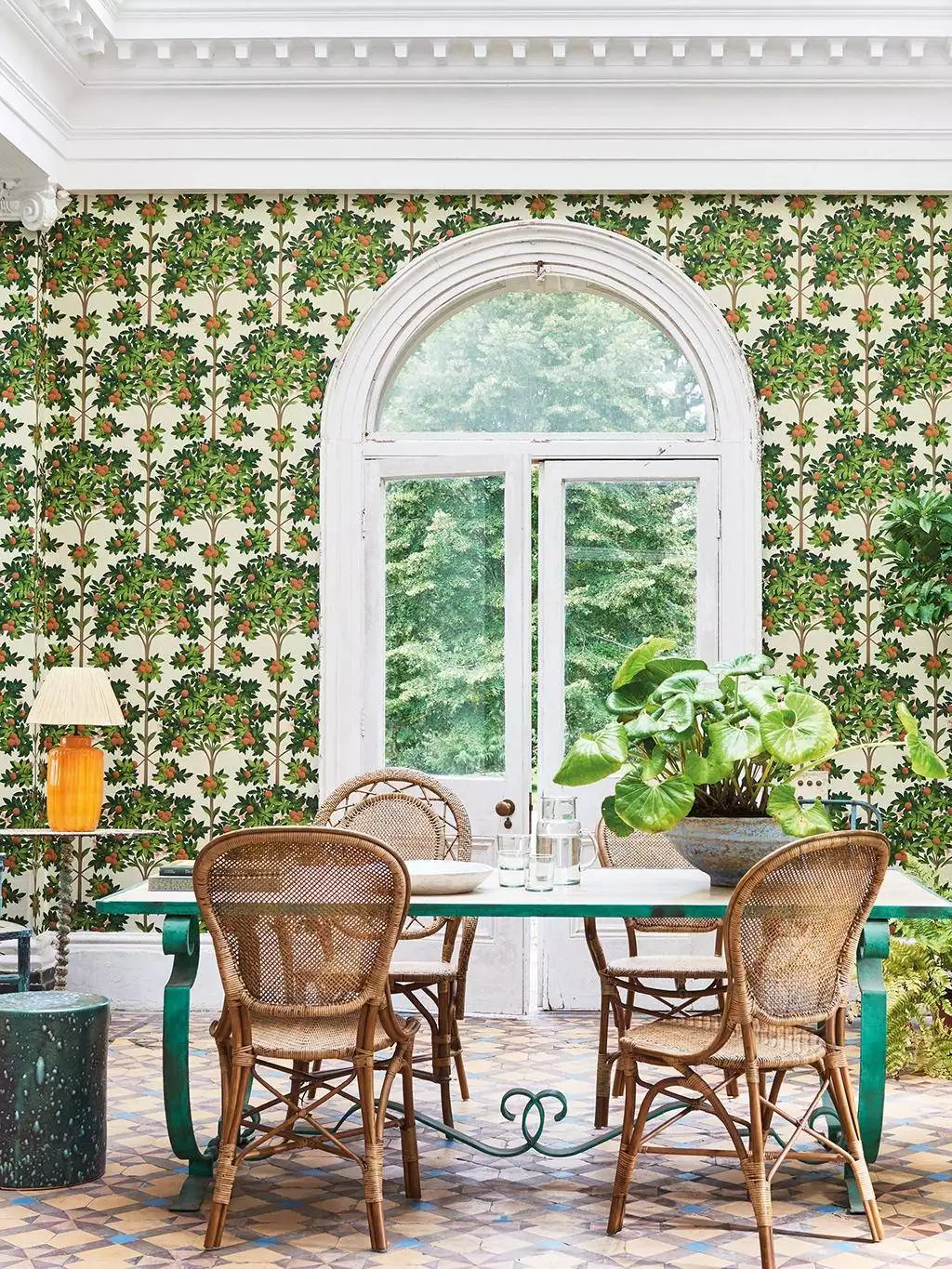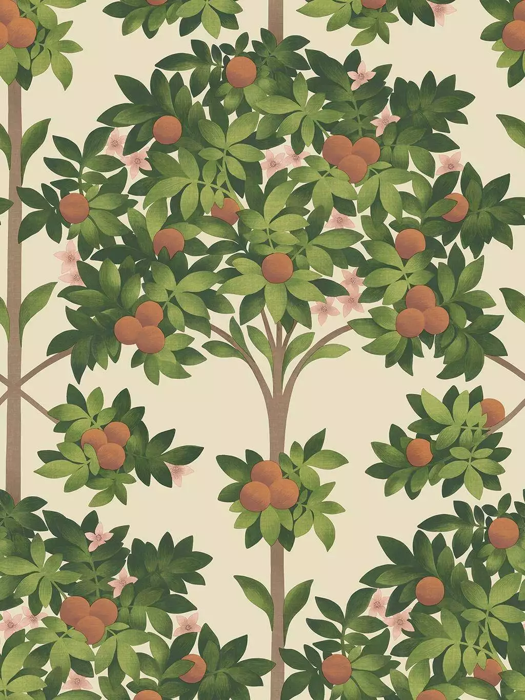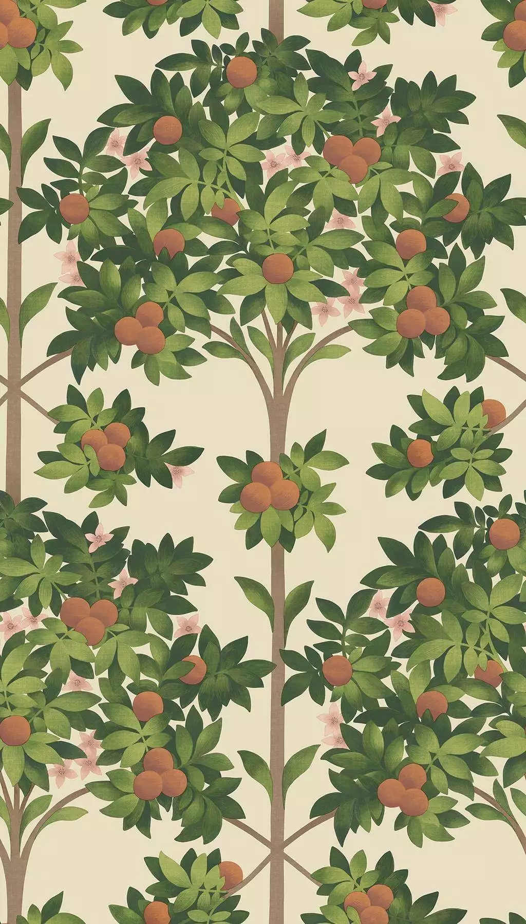 Die Tapete "Orange Blossoms" strahlt Sommerwärme aus und fängt die Atmosphäre in Sevilla ein, wo es von Obstbäumen, insbesondere Orangenbäumen in den Straßen und Höfen nur so wimmelt. Orangenbäume mit reifen Früchten sind auf diesem Design liebevoll dargestellt.