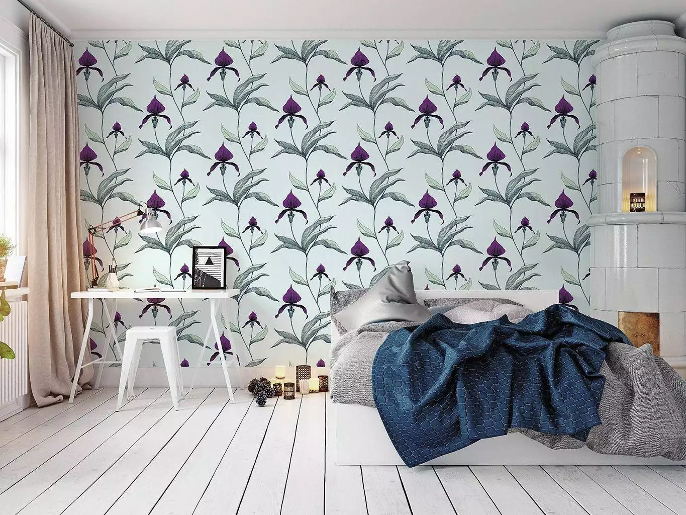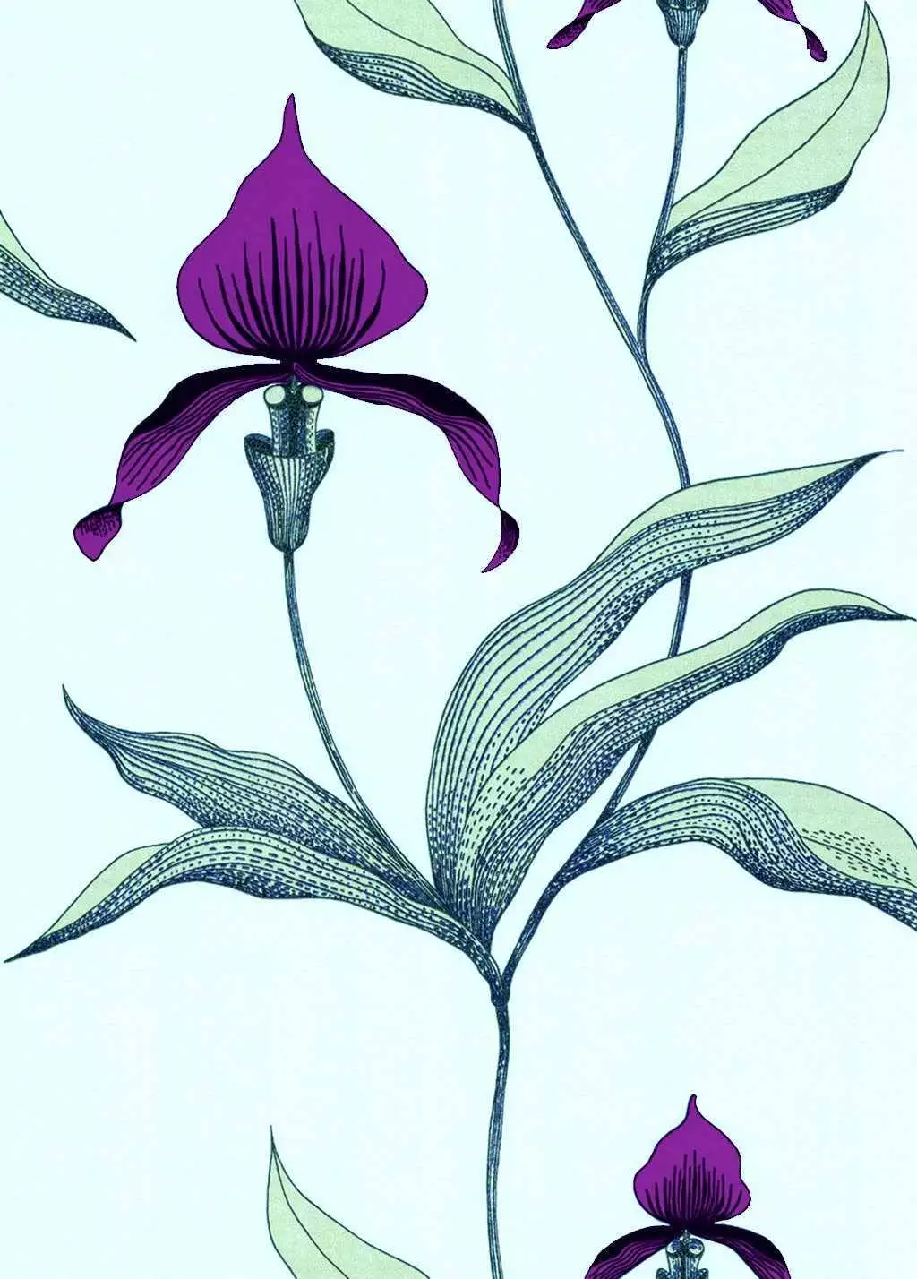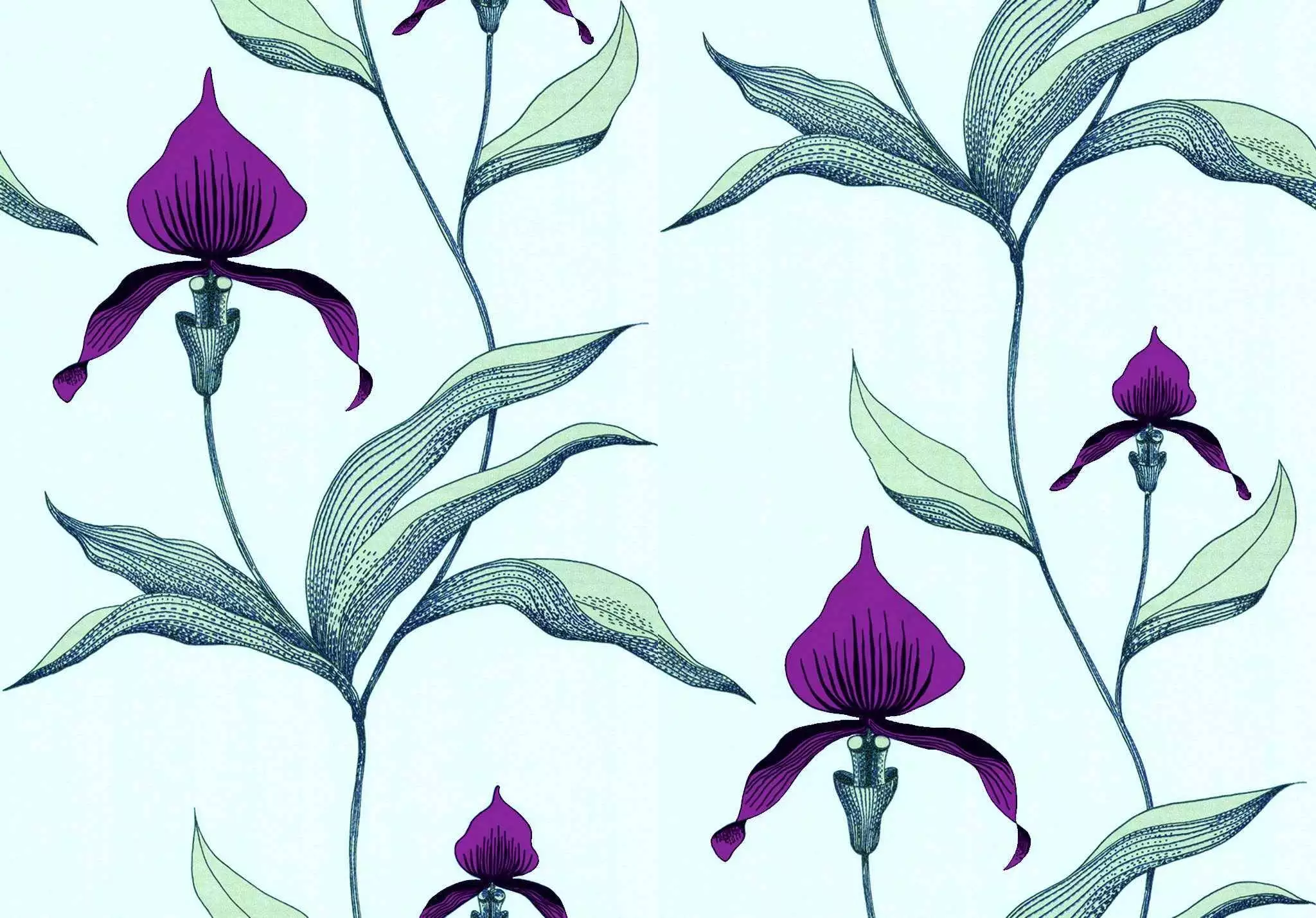 Die Tapete "Orchid" präsentiert ein beeindruckendes Orchideenmuster. Die violette Orchidee, ein Symbol für Gerechtigkeit, Bedachtsamkeit und Weisheit, erstreckt sich großflächig auf der Tapete. Die auffälligen Blüten ruhen dabei auf länglichen Blättern. Dieses einladende Design eignet sich hervorragend für das Wohnzimmer, aber auch für ein verspielt eingerichtetes Schlafzimmer, wo es einen charmanten Lebensraum schafft.