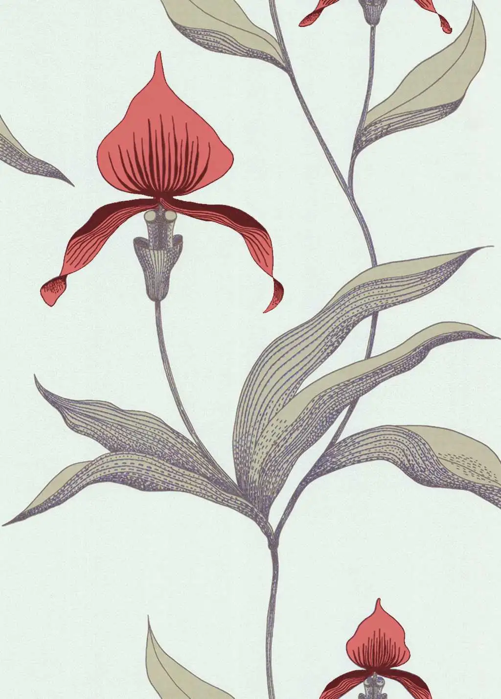 Die Tapete "Orchid" präsentiert ein beeindruckendes Orchideenmuster. Die rote Orchidee, ein Symbol für eidenschaft, Liebe und Hingabe, erstreckt sich großflächig auf der Tapete. Die auffälligen Blüten ruhen dabei auf länglichen Blättern. Dieses einladende Design eignet sich hervorragend für das Wohnzimmer, aber auch für ein verspielt eingerichtetes Schlafzimmer, wo es einen charmanten Lebensraum schafft.