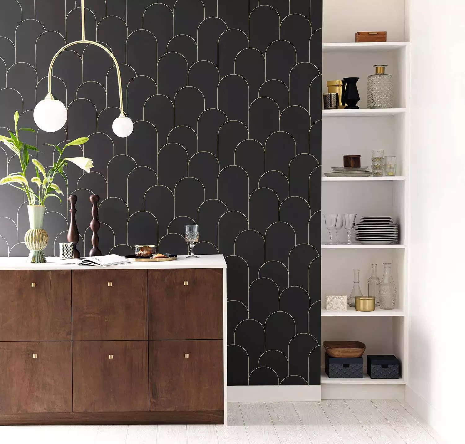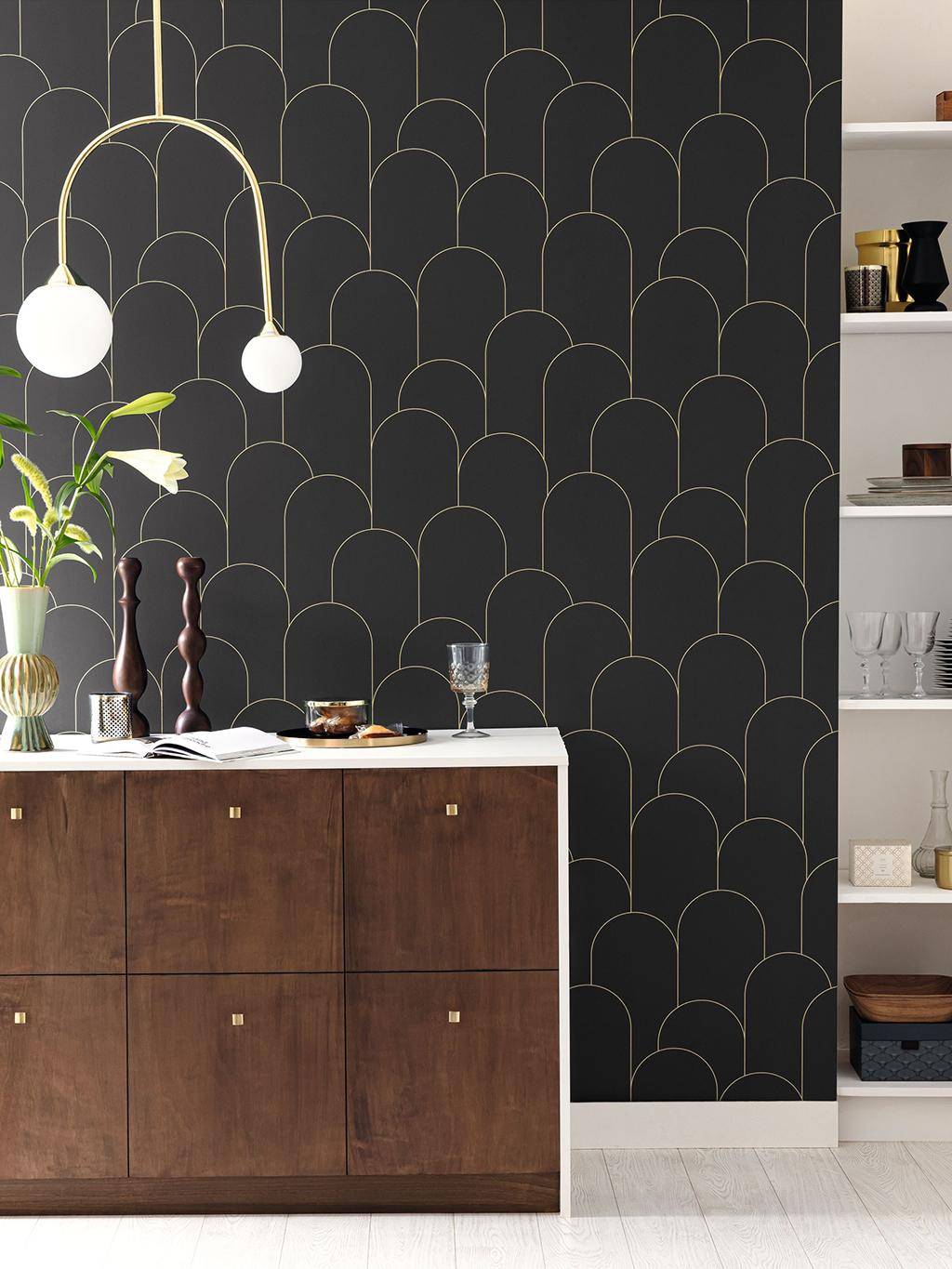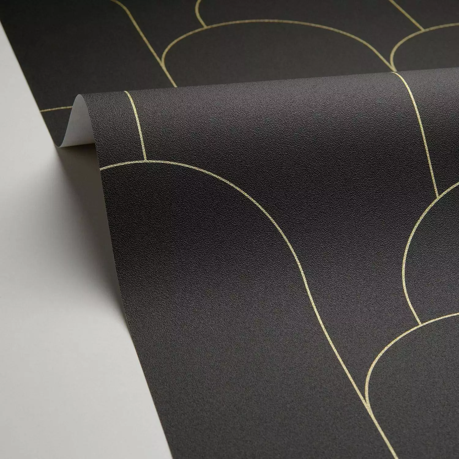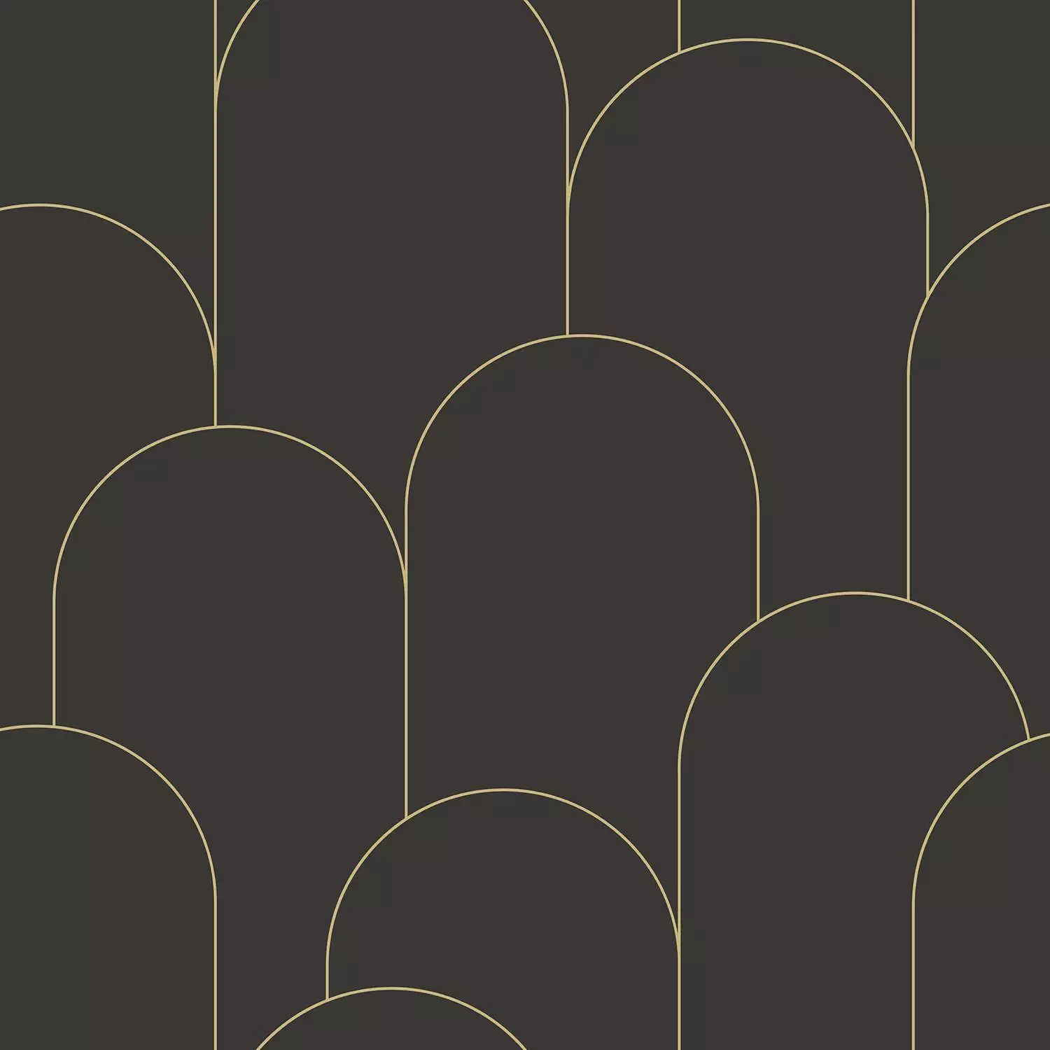 Klare Bögen, feine Linien – die Tapete Ornament Noir dore aus der Kollektion Elegance zeigt Art-Déco in seiner modernsten Form. Ornament spielt mit Geometrie und Wiederholung. Die grafische Ruhe der Bögen bringt Struktur und Gelassenheit in jeden Raum – dezent, ausgewogen und mit einem Hauch von Eleganz.