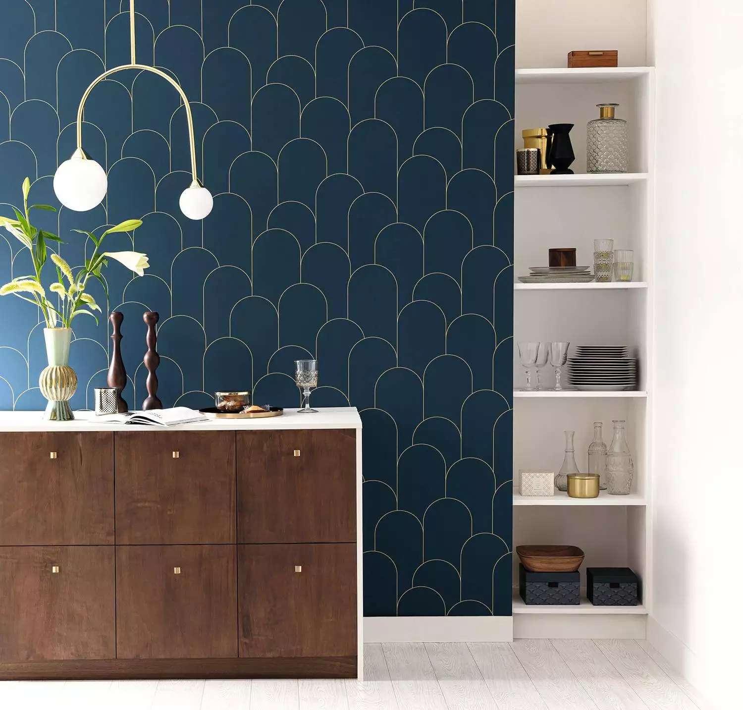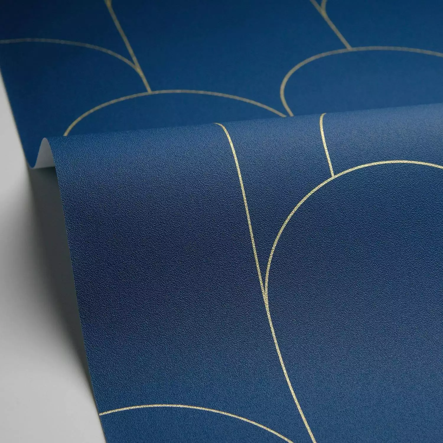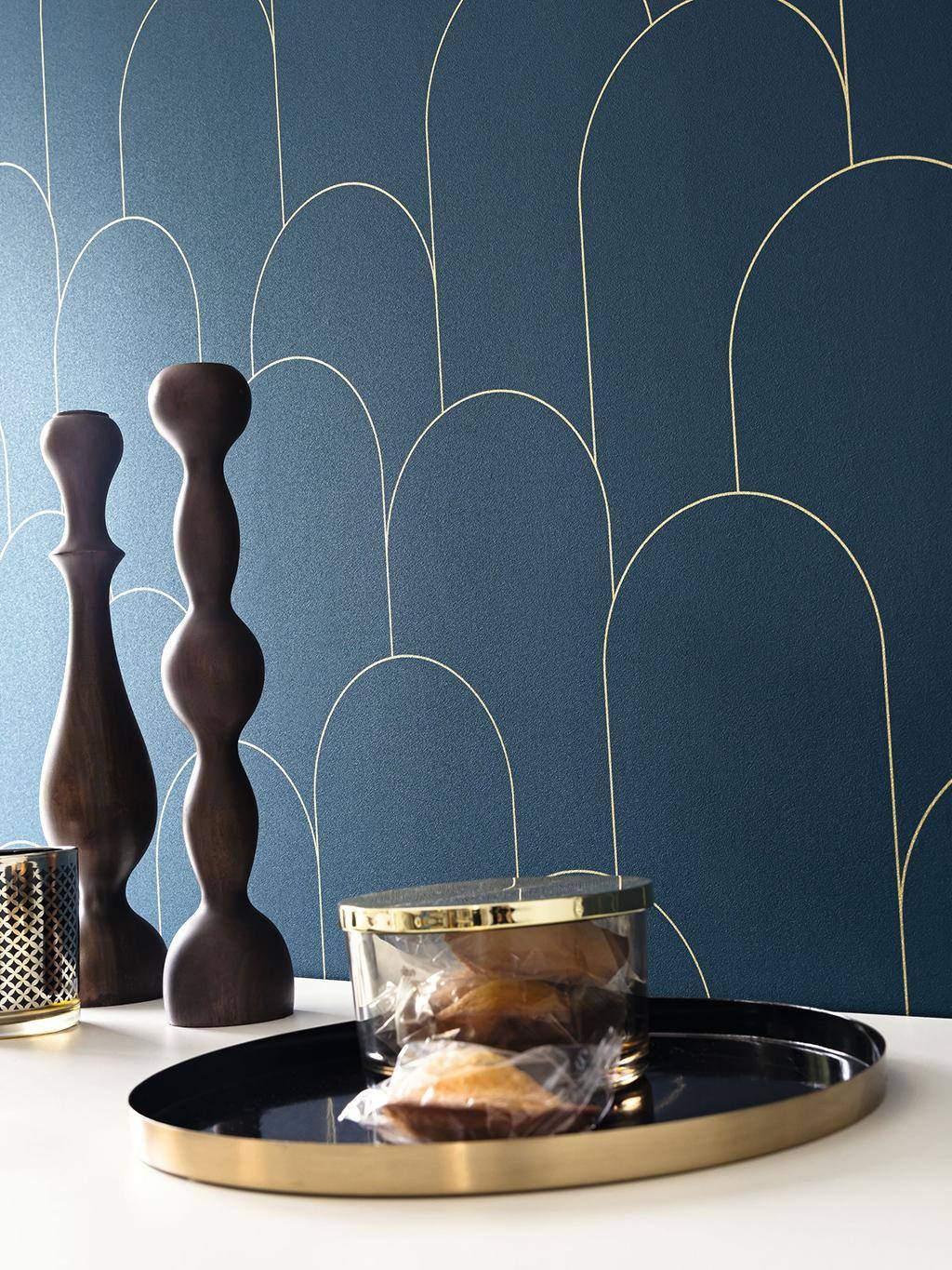 Klare Bögen, feine Linien – die Tapete Ornament Bleu nuit dore aus der Kollektion Elegance zeigt Art-Déco in seiner modernsten Form. Ornament spielt mit Geometrie und Wiederholung. Die grafische Ruhe der Bögen bringt Struktur und Gelassenheit in jeden Raum – dezent, ausgewogen und mit einem Hauch von Eleganz.