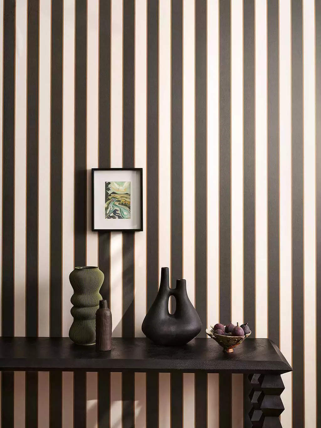 Die Tapete Orsin entstammt dem Hause Romo und zählt zur Kollektion Aubin. Streng und sinnlich zugleich spielt Orsin mit dem Rhythmus geometrischer Streifen und der Weichheit handwerklicher Textur. Das matte Schwarz trifft auf Kreideweiß, getrennt durch einen feinen, warmen Ton, der das Auge führt und das Gleichmaß durchbricht. Eine moderne Interpretation klassischer Linien – ruhig im Ausdruck, voller Charakter, wie ein stiller Taktgeber im Raum.
