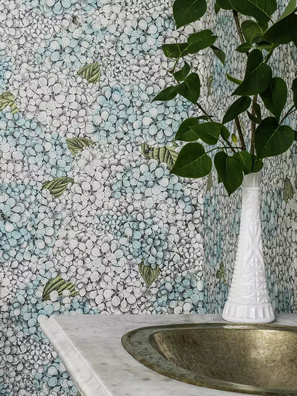 „Ortensia“ ist ein detailreiches Tapetendesign, das Barnaba Fornasetti auf Basis eines Originals aus dem Atelier seines Vaters entwickelte. Die dicht gesetzten Blüten sind mit feinem Punkt- und Linienduktus gezeichnet, fast wie gestochen. Kleine Blätter und Bienen setzen ruhige Akzente inmitten der gleichmäßigen Struktur. In col. 44 prägen helle Blautöne und kühles Weiß das Bild – zurückhaltend, fast luftig, bei gleichzeitig hoher grafischer Dichte. Die Zeichnung bleibt auch in der Fläche klar erkennbar und ist dekorativ, ohne in Bewegung oder Farbe zu übertreiben.