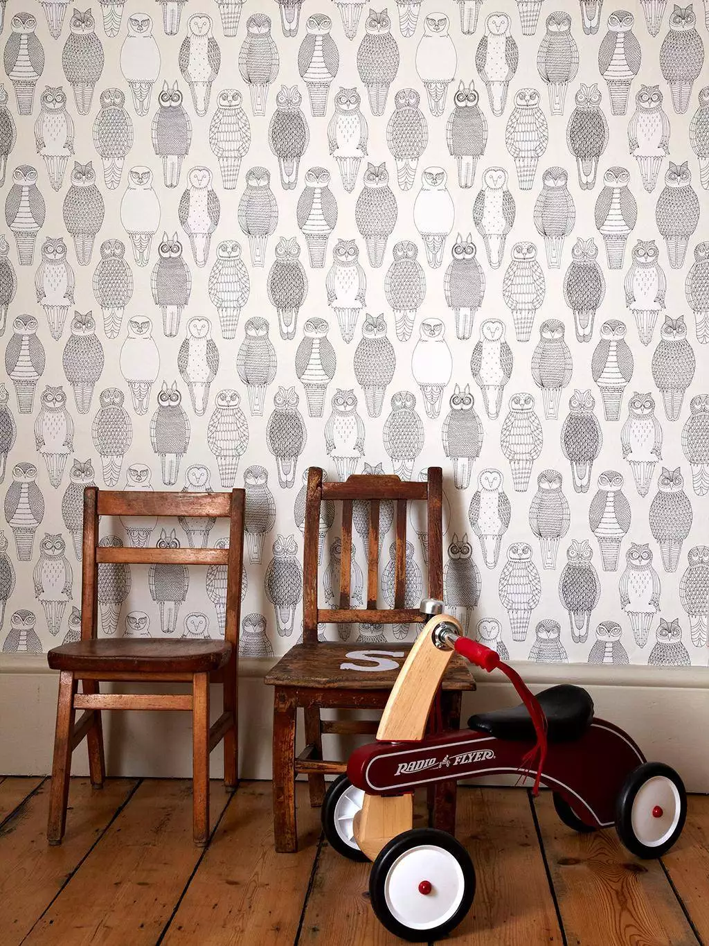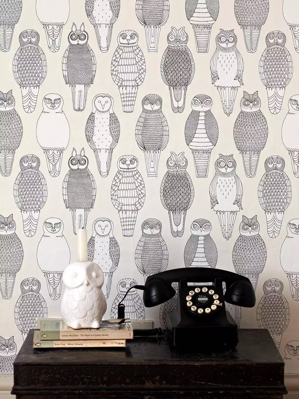 Abigail Edwards' Owls of the British Isles. Zehn verschiedene Eulen Arten, jede mit eigenem Ausdruck, wachen still über die Wand – von der Schneeeule bis zum Steinkauz. In feinen, handgezeichneten Linien entsteht ein rhythmisches Muster, das Ruhe und Charakter ausstrahlt. Die Tapete wirkt grafisch, klar und charmant verspielt – ein leises Spiel zwischen Naturbeobachtung und Design.