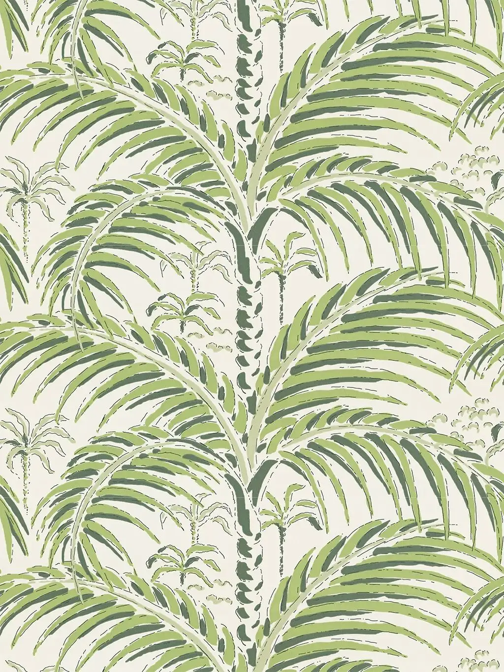 Als wäre das Motiv direkt auf die Wand gemalt, wirkt diese Palmen Tapete sehr dynamisch mit ihrem ungewöhnlich großen Muster im Vordergrund. Sanftes grün auf gebrochenem weiß unterstreicht eine exotische Leichtigkeit, die unserer Wohnung eine sommerliche Atmosphäre verleiht.