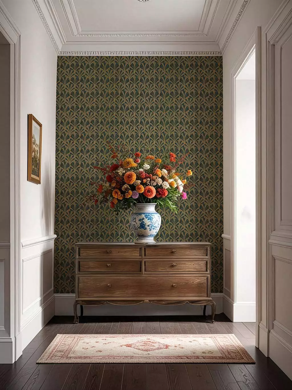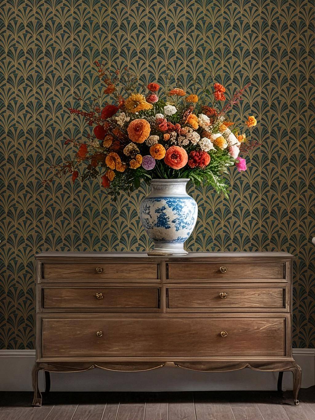 Stellen Sie sich vor, Sie betreten einen Raum, den ein sanftes Licht durchflutet. Hinter Ihnen verschwindet der Alltag. Vor Ihnen entfaltet sich ein Welt voller Art Deco mit goldenen Palmenfächern auf tiefem Grün – elegant, rhythmisch, mit Stil. Die Tapete Palmette in Gold/Grün verwandelt Ihre Wände in eben diese Kulisse. Holen Sie sich den kultivierten Charme des Art Déco in Ihr Zuhause und geben Sie Ihrem Raum einen Hauch Glamour – elegant, stilsicher, präzise.