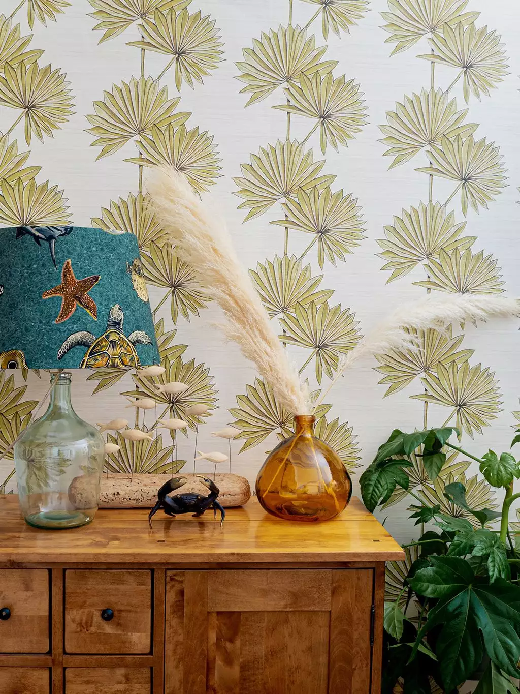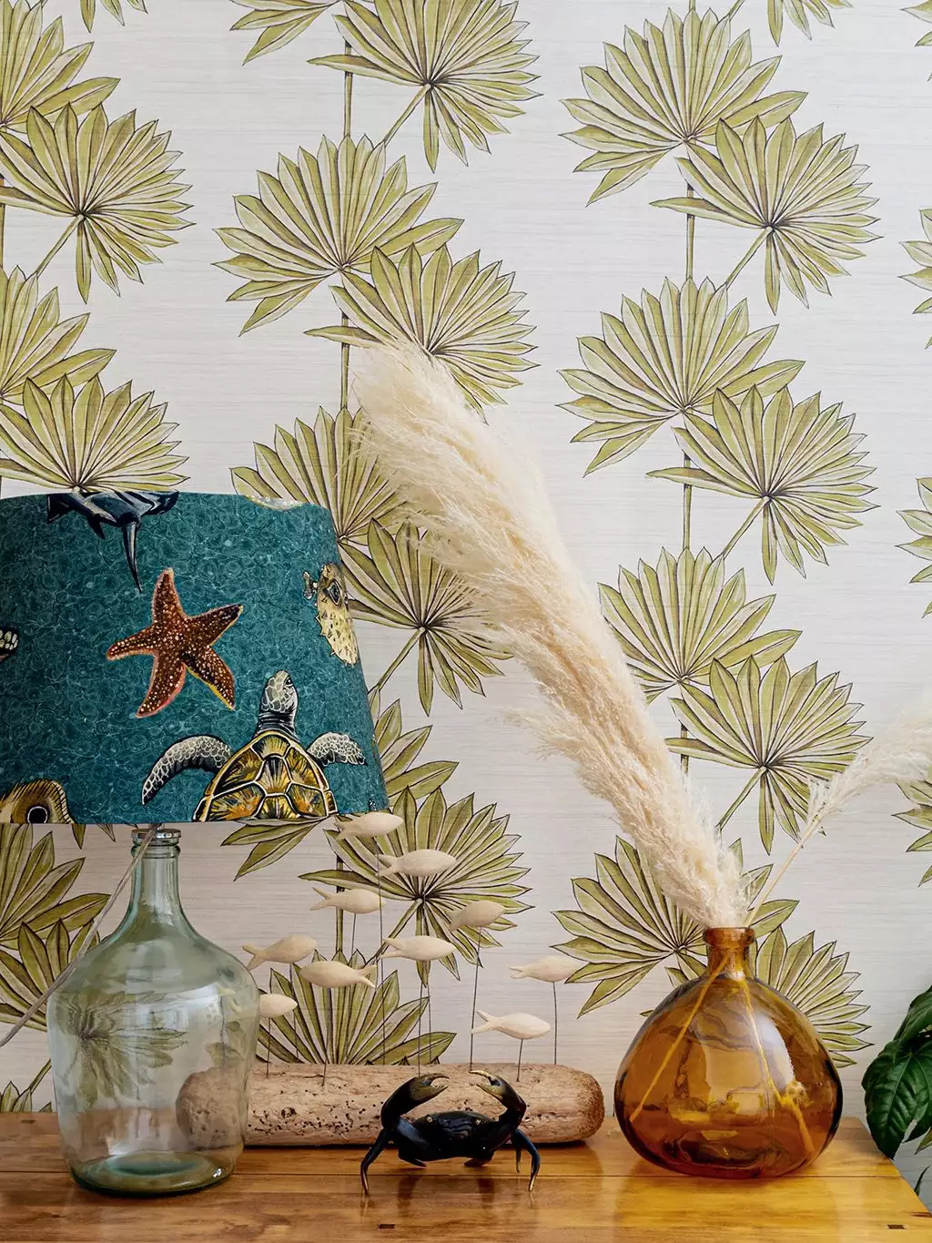 Palmetto ist ein wunderschöner böhmischer Druck mit getrockneten Palmen. Er präsentiert handgemalte Fächerpalmen. Der Name Palmetto leitet sich von der Serenoa Repens ab, einer kleinen Fächerpalmenart, die in den südlichen US-Bundesstaaten und im nördlichen Südamerika vorkommt. Die Farbpalette besteht aus natürlichen Farbtönen auf einem frischen, cremefarbenen Hintergrund.
