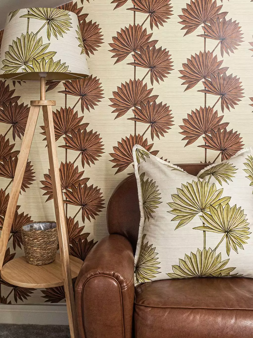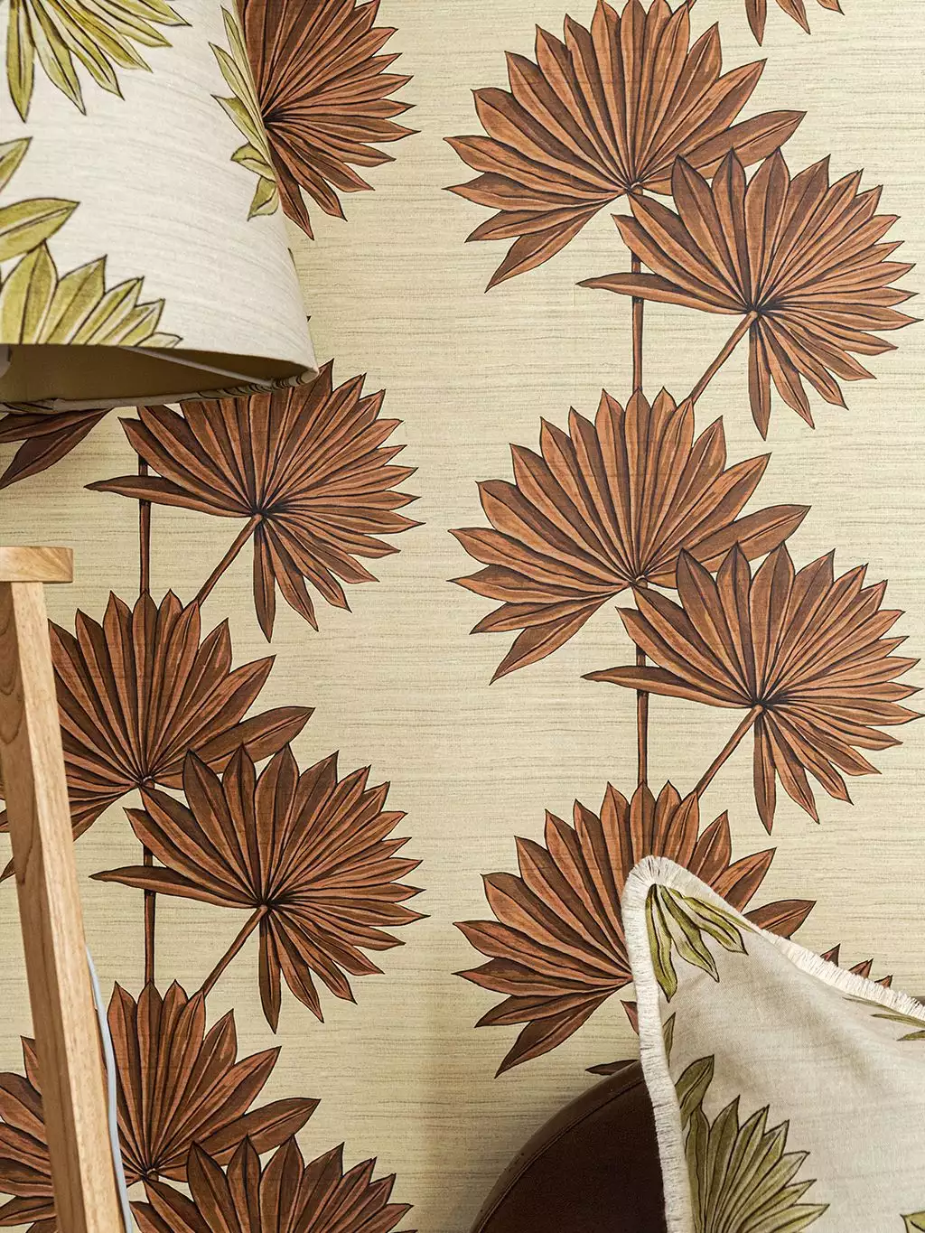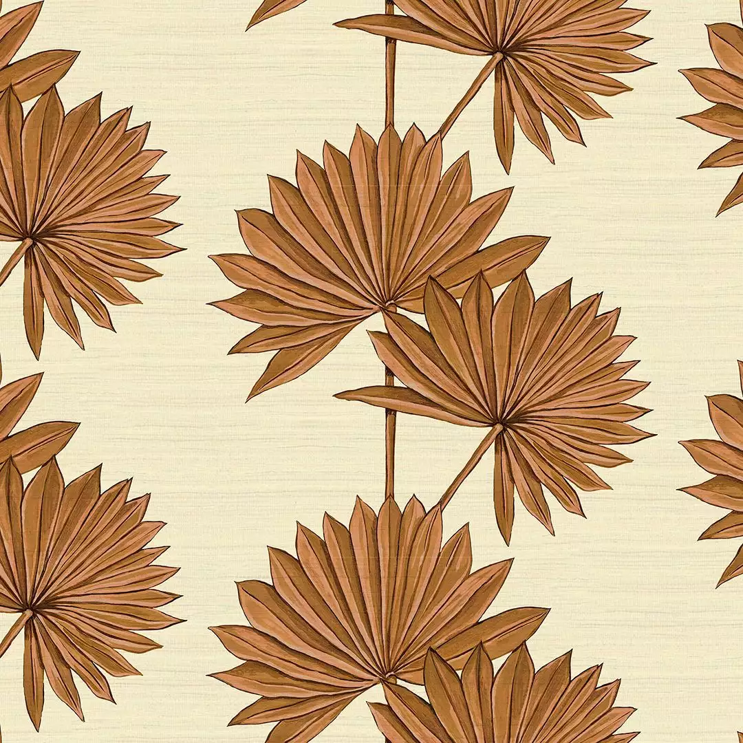 Palmetto ist ein wunderschöner böhmischer Druck mit getrockneten Palmen. Er präsentiert handgemalte Fächerpalmen. Der Name Palmetto leitet sich von der Serenoa Repens ab, einer kleinen Fächerpalmenart, die in den südlichen US-Bundesstaaten und im nördlichen Südamerika vorkommt. Die Farbgebung besteht aus einem Karamelbraun auf einem frischen, cremefarbenen Hintergrund.