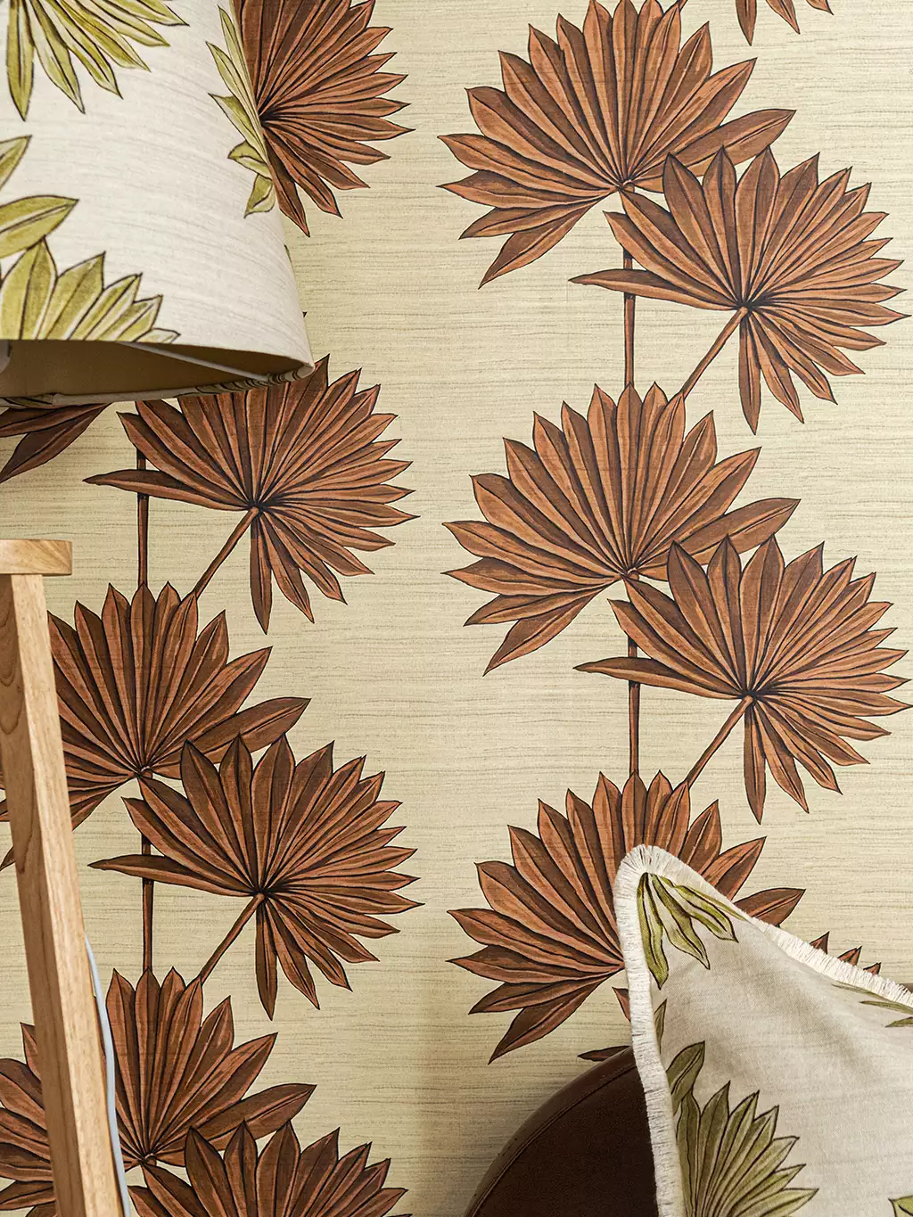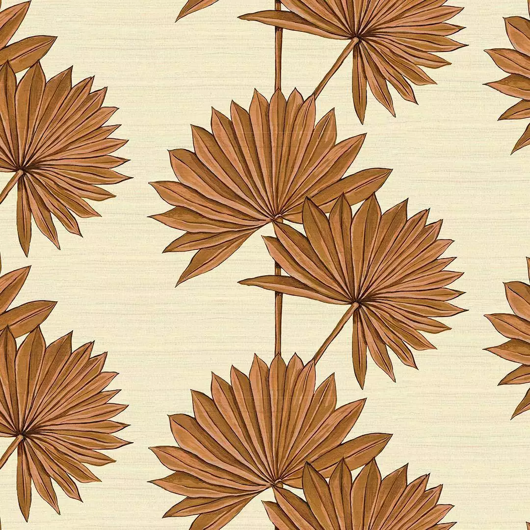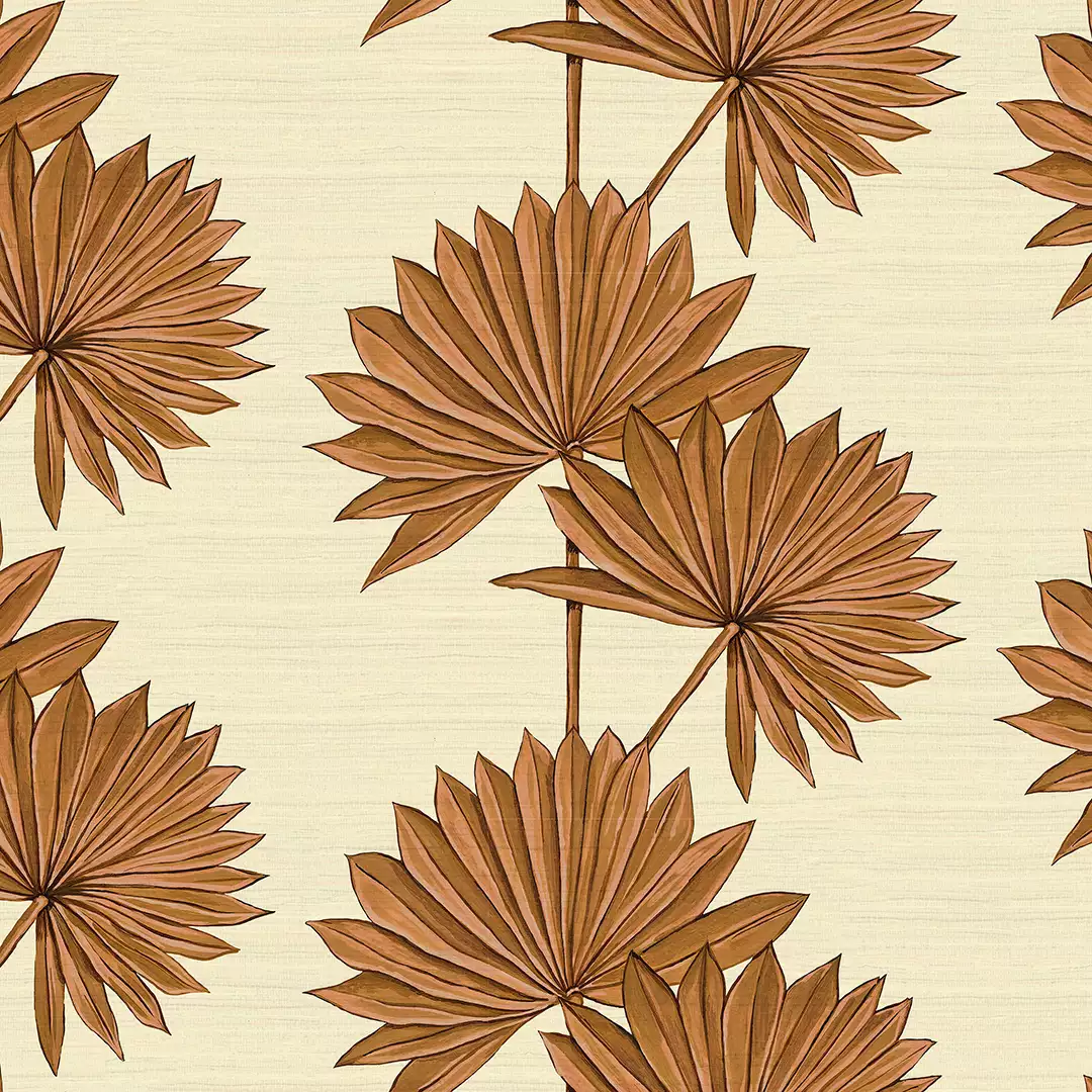 Palmetto ist ein wunderschöner böhmischer Druck mit getrockneten Palmen. Er präsentiert handgemalte Fächerpalmen. Der Name Palmetto leitet sich von der Serenoa Repens ab, einer kleinen Fächerpalmenart, die in den südlichen US-Bundesstaaten und im nördlichen Südamerika vorkommt. Die Farbgebung besteht aus einem Karamelbraun auf einem frischen, cremefarbenen Hintergrund.