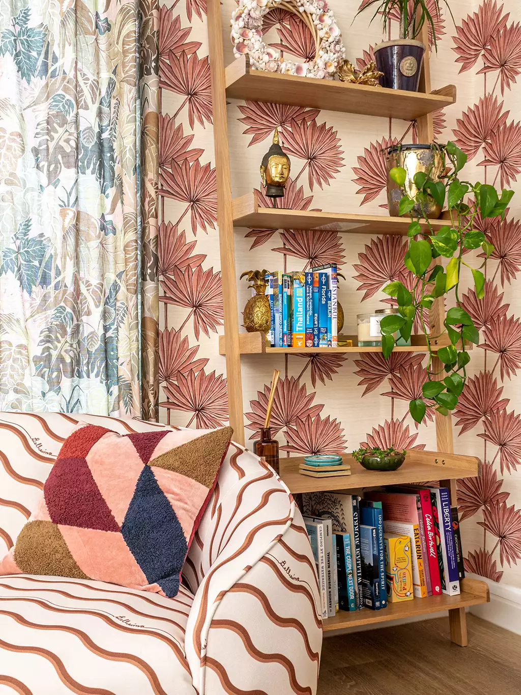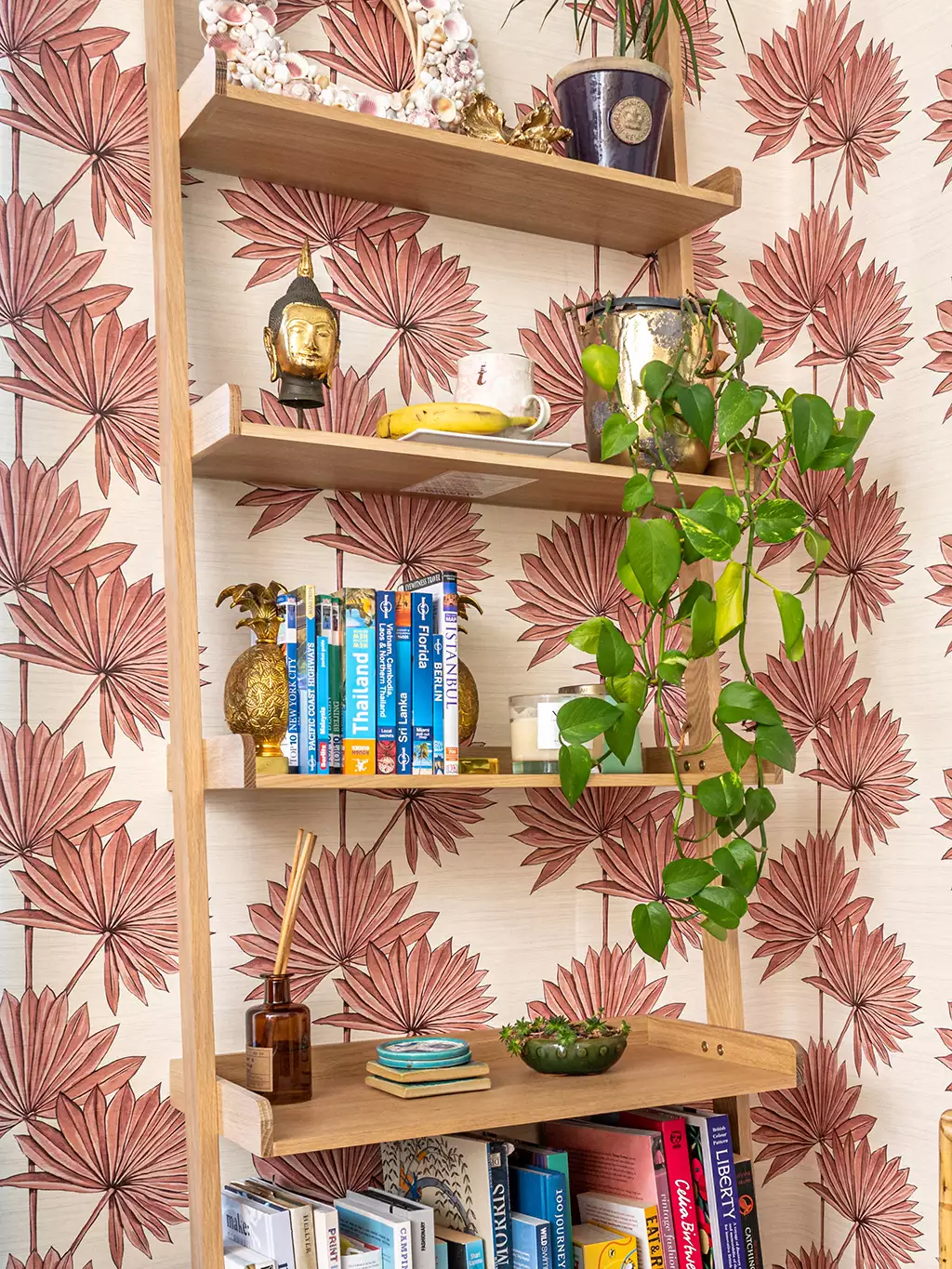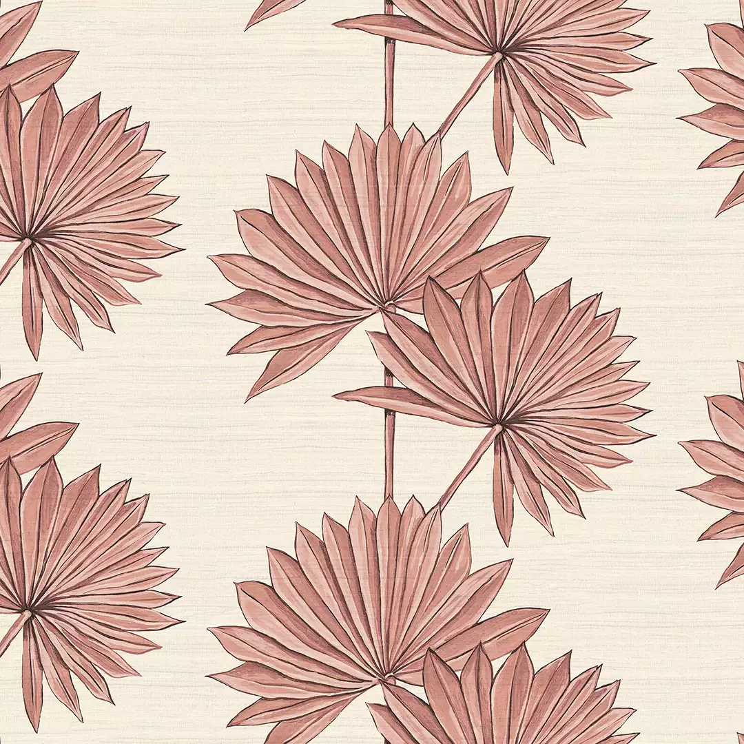Palmetto ist ein wunderschöner böhmischer Druck mit getrockneten Palmen. Er präsentiert handgemalte Fächerpalmen. Der Name Palmetto leitet sich von der Serenoa Repens ab, einer kleinen Fächerpalmenart, die in den südlichen US-Bundesstaaten und im nördlichen Südamerika vorkommt. Die Farbgebung besteht aus einem natürlichen Rosa auf einem hellen, cremefarbenen Hintergrund.