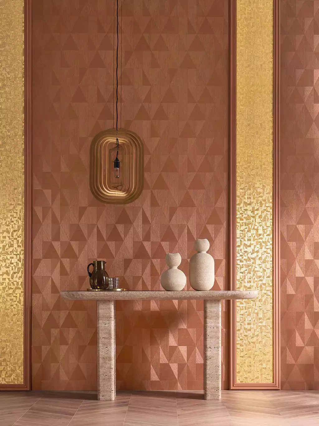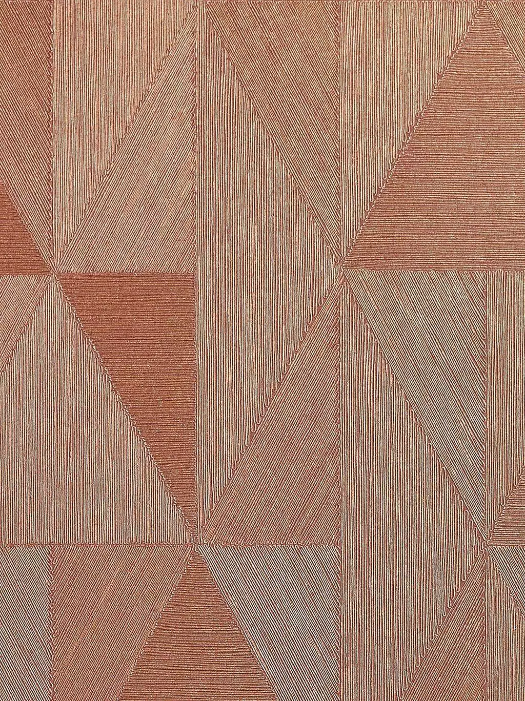 Die Tapete Parangon in Kupfer aus der Kollektion Textures Métalliques zeigt ein geometrisches Muster aus verschachtelten Rauten, Triangles und Linien. Von weitem mutet das Design leicht dreidimensional an, fast wie eine geschliffene Kristalloberfläche. In der Variante Kupfer entfaltet es warmen, metallischen Glanz mit feiner Patina. Die klare Struktur fängt das Licht ein und verleiht der Wand Tiefe, Bewegung und definitiv einen edlen Twist.