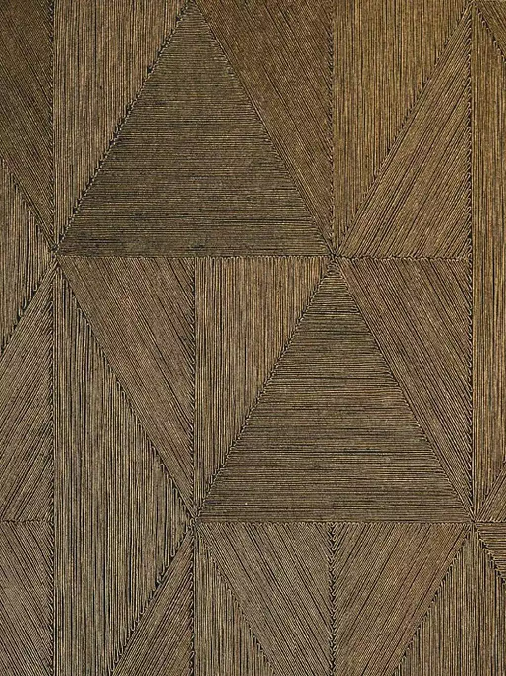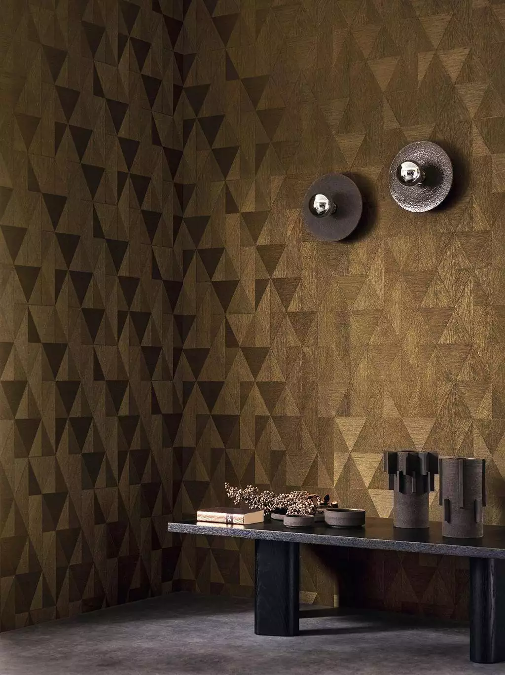 Die Tapete Parangon in Schwarz / Gold aus der Kollektion Textures Métalliques zeigt verschachtelte Rauten, Dreiecke und Linien, die wie facettierte Kristalle wirken. In Schwarz und Gold erhält das Muster eine markante Strahlkraft: dunkle Tiefe trifft auf metallischen Glanz. Das Spiel aus Kontrast und Licht verleiht der Wand Eleganz, Dynamik und einen luxuriösen Akzent.