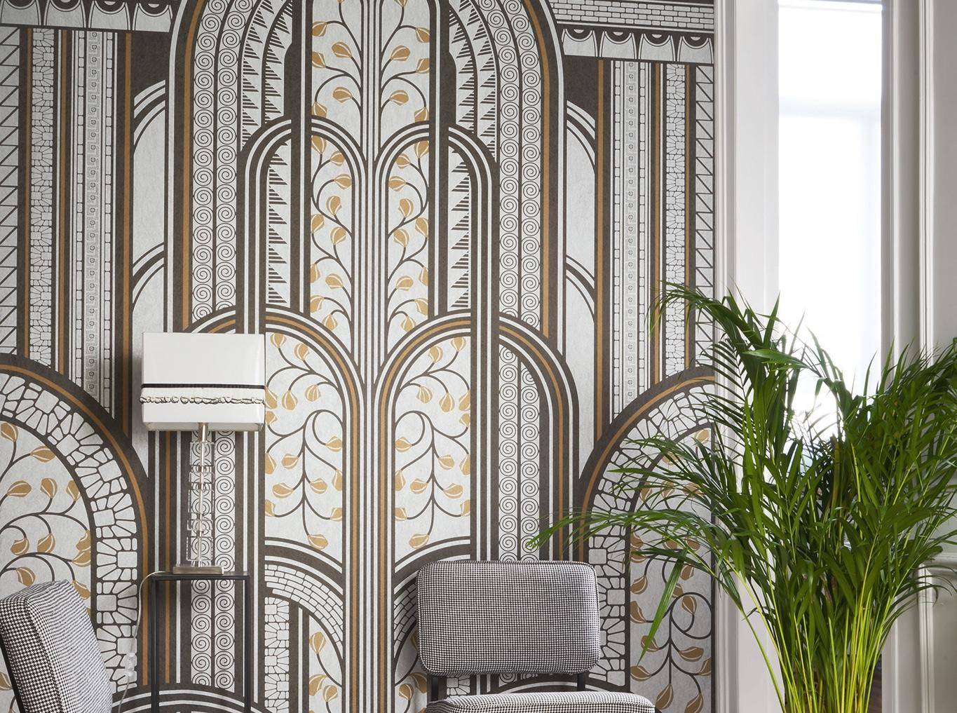 Dieses luxuriöse Panoramatableau bringt deutlich mehr Energie mit als klassische, zurückhaltende Art-Déco-Designs. Die geschwungenen geometrischen Formen und die intensiv gearbeiteten Pflanzenmotive entfalten eine lebendige, fast bühnenhafte Wirkung. Die metallischen Akzente verstärken die Tiefe und machen das Motiv zu einem starken Highlight an der Wand. Ideal, wenn ein Raum bewusst Ausdruck, Farbe und Präsenz tragen soll.