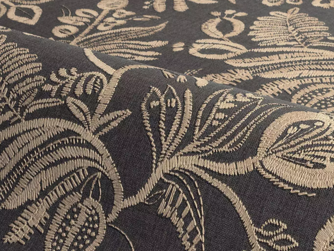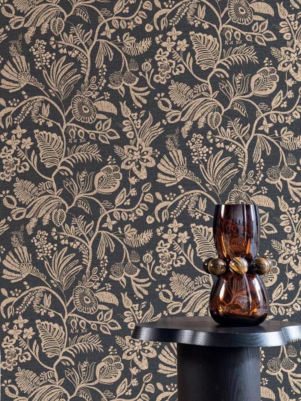 Die kunstvolle Tapete Pastel Ébène wird heziert von einem dichten Floralmotiv, wie gestickt gedacht. Feine Linien und gefüllte Formen erzeugen Tiefe und eine textile Anmutung. Der dunkle Fond trägt das warme Dessin und gibt dem Raum Ruhe und Gewicht. Eine Fläche mit Präsenz, die Möbel erdet und Licht weich aufnimmt. Von Casamance, inspiriert von traditioneller Stickkunst und präzise umgesetzt.