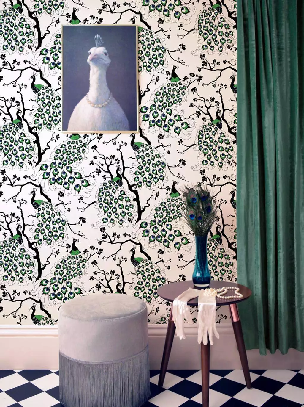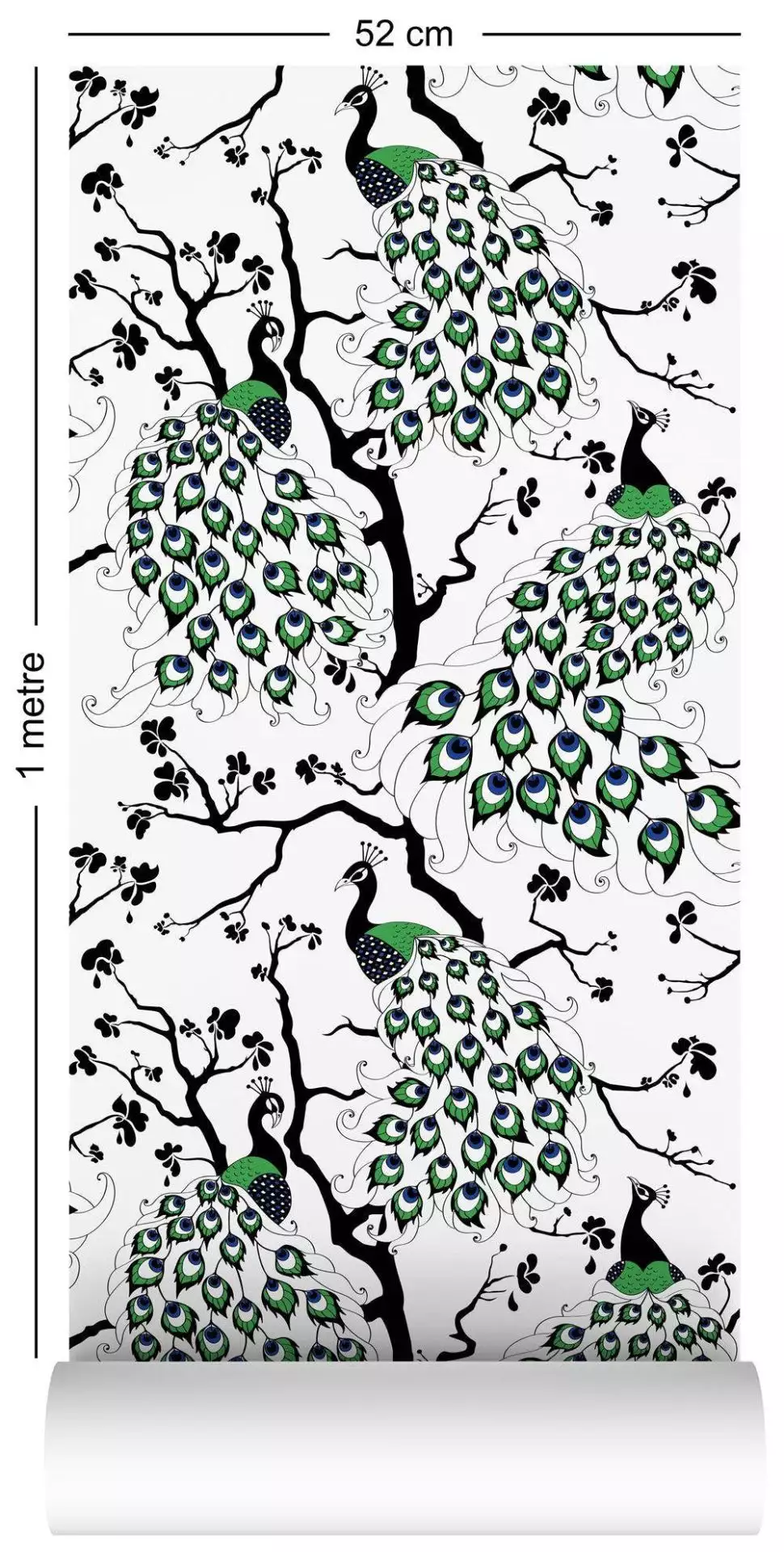 Mit der Tapete Peacock von Dupenny zieht frische Eleganz in den Raum. Verspielte Pfauen mit detailreich gezeichnetem Gefieder entfalten auf zarten Ästen ihre ganze Pracht und bringen einen Hauch orientalischer Inspiration an die Wand. Die klaren Kontraste von Schwarz, Weiß und Grün wirken modern, gleichzeitig zeitlos und künstlerisch. Ob im Wohnzimmer, im kreativen Büro oder als markantes Statement im Flur – diese Tapete erzählt Geschichten voller Leichtigkeit und verwandelt jeden Raum in einen besonderen Blickfang.