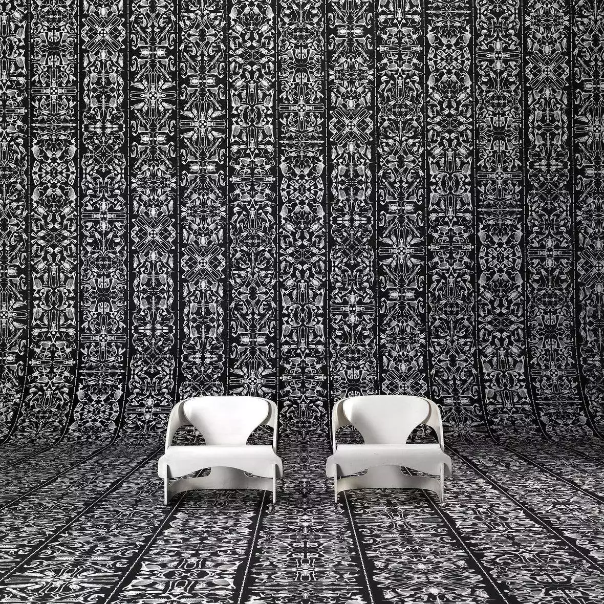 Die Designtapete Perished inszeniert Vergänglichkeit als ornamentale Ordnung. Auf tiefschwarzem Grund verdichten sich filigrane Skelette und Fragmente zu vertikalen Achsen. Das Muster wirkt grafisch präzise, fast wie ein Archiv naturkundlicher Studien. Die klare Rhythmik schafft Tiefe und Spannung zwischen Kunstobjekt und Architektur, ideal für mutige Interieurs. Die Archivtapete von Studio Job wurde auf der ICFF New York mit dem Editor’s Award ausgezeichnet.