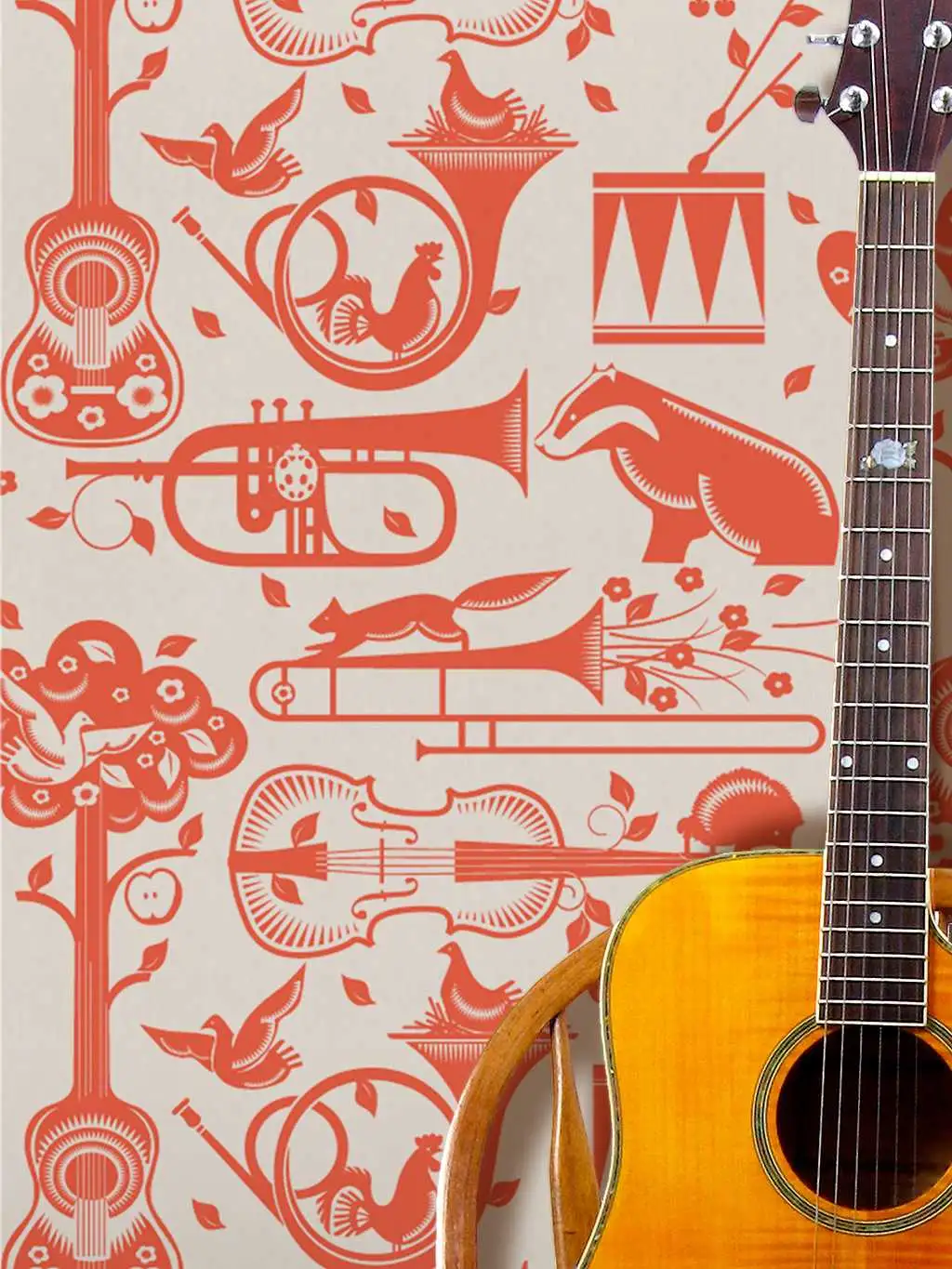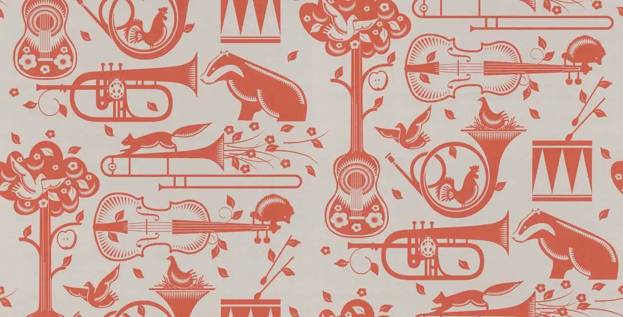 Die beliebte Tapete Pet Sounds zeigt eine Mischung aus Musikern aus dem Wald und dem obligatorischen Vogel, der in einem Waldhorn nistet.