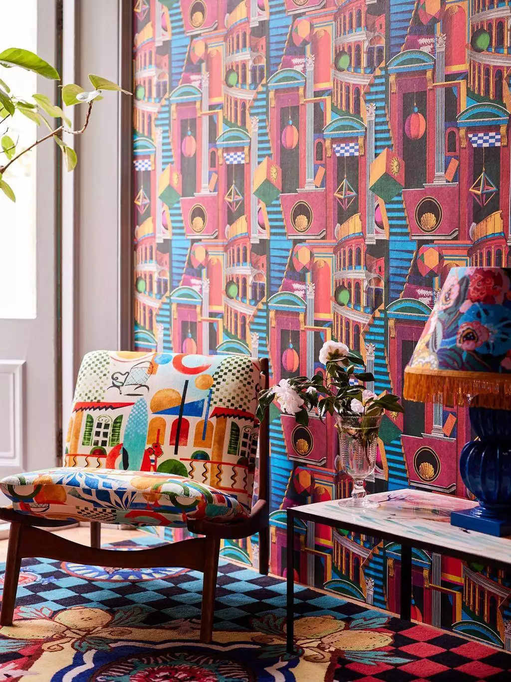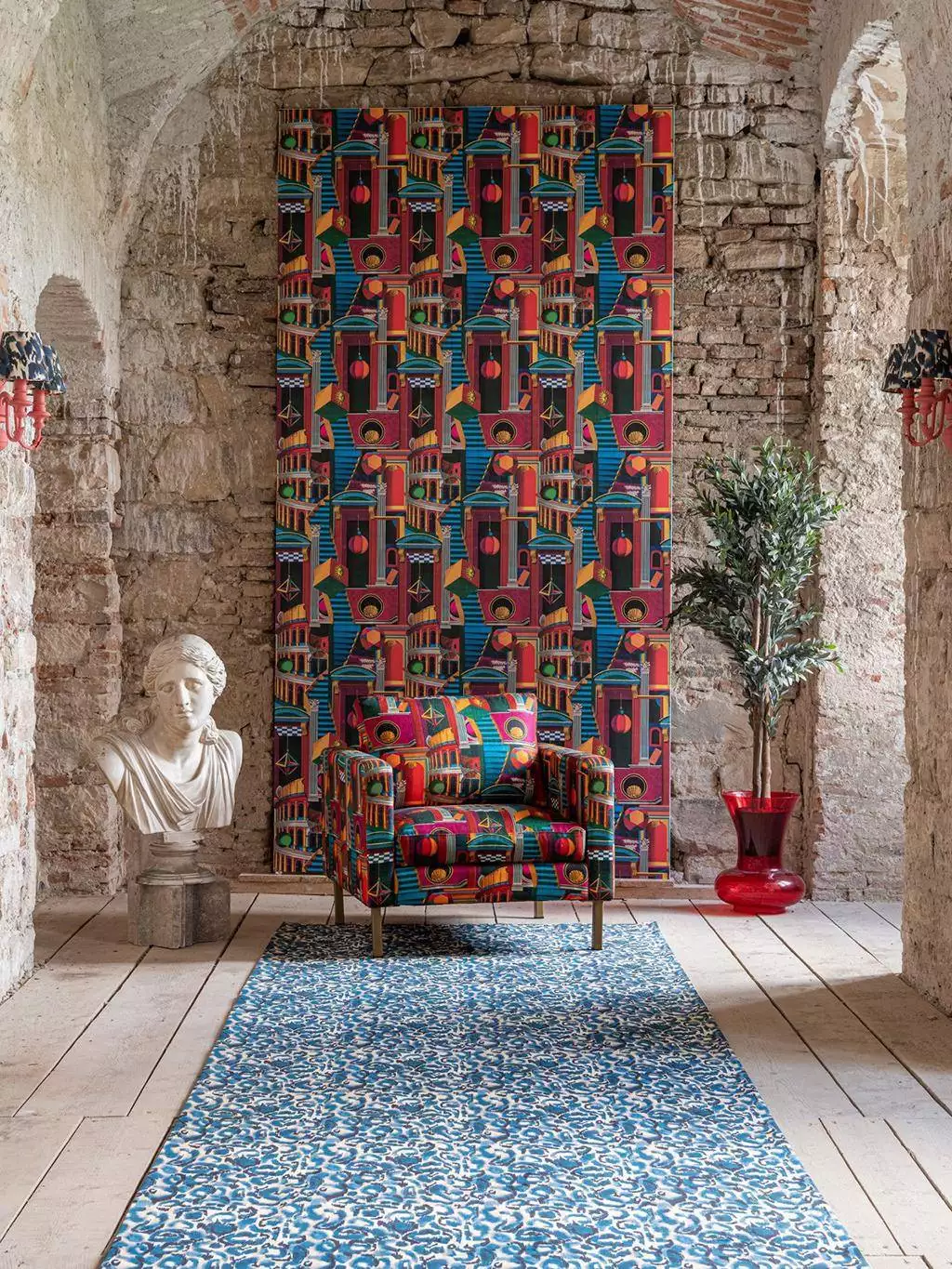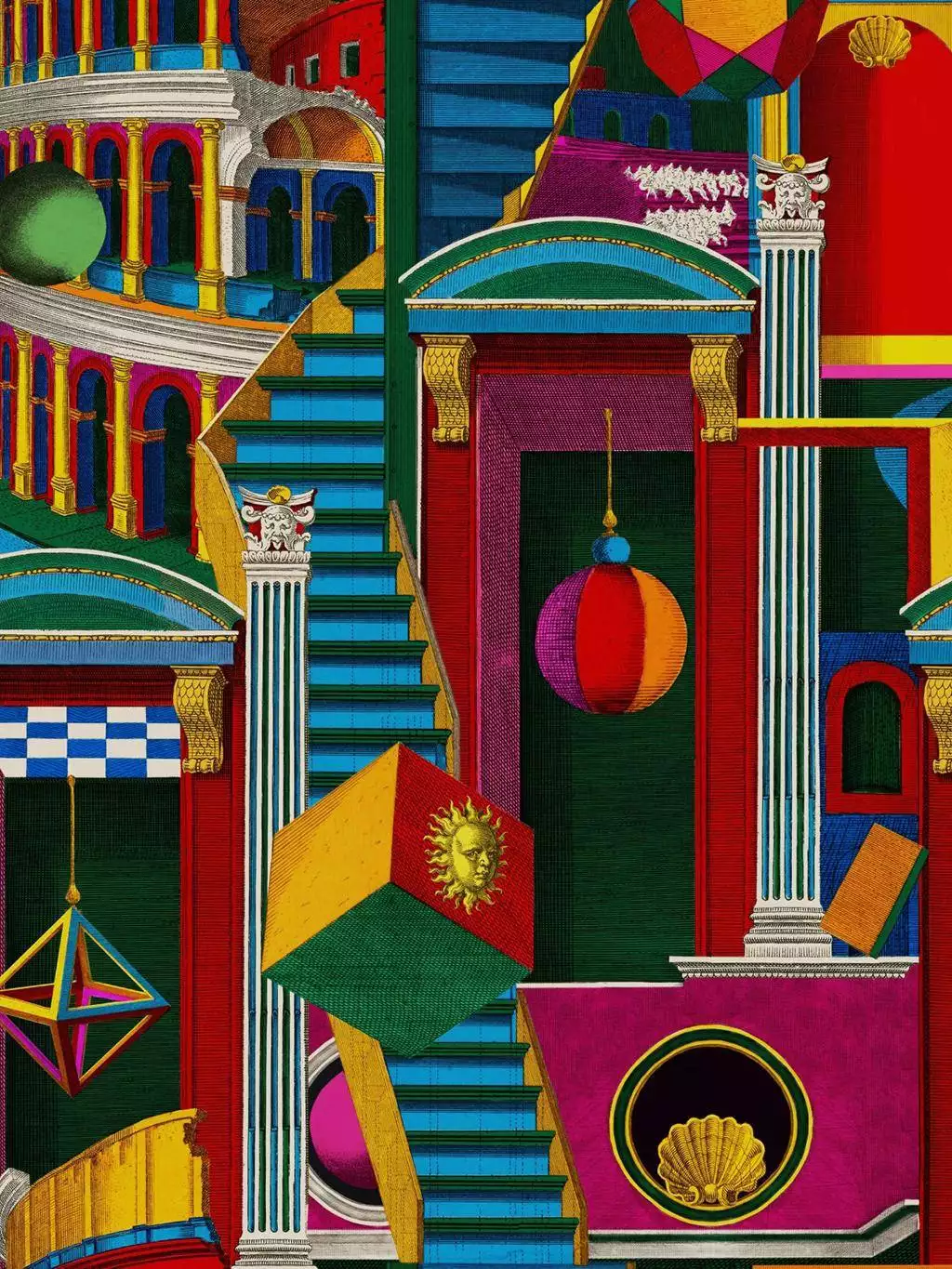 Die Tapete „Piazza degli Arlecchini“ entführt Sie in eine fantasievolle Welt voller architektonischer Wunder und lebendiger Farben. Inspiriert von der italienischen Commedia dell'arte, präsentiert diese Tapete eine verspielte Kombination aus klassischer Architektur, verspielten Formen und strahlenden Farbtönen. Die harmonische Mischung aus Treppen, Säulen und geometrischen Elementen erzeugt eine faszinierende Tiefenwirkung, die den Raum optisch vergrößert und ihm eine unverwechselbare Dynamik verleiht.