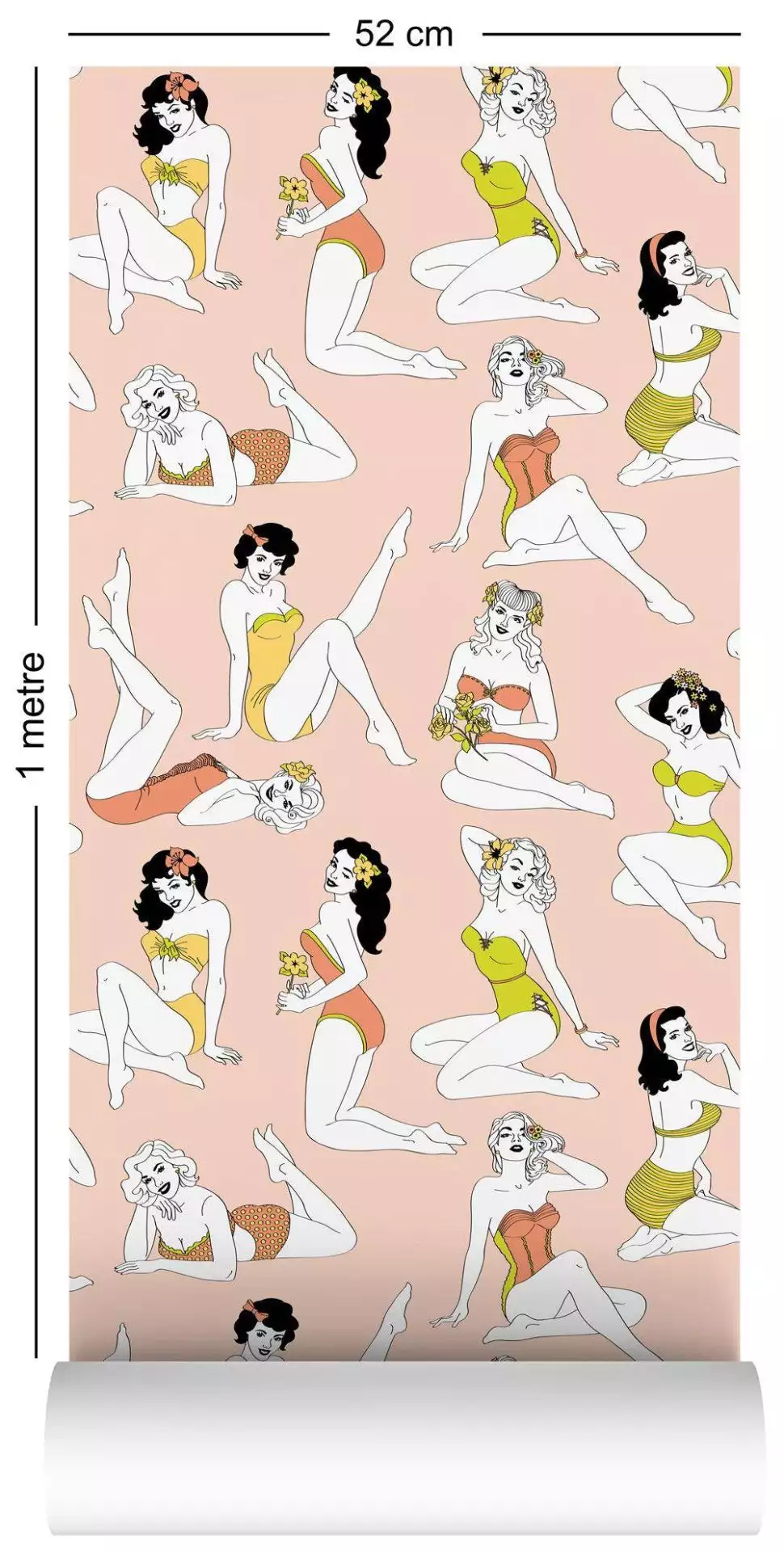 Diese Boutique-Pin-Up-Tapete von Dupenny ist eine Hommage an die großen amerikanischen Pin-Up-Künstler und Models der Vergangenheit. Wenn Sie ein Fan der Werke von Gil Elvgren, Alberto Vargas und George Petty sind, dann ist diese Tapete genau das Richtige für Sie! Erlauben Sie diesen drallen Schönheiten, Ihr Schlafzimmer, Ihr Boudoir und vieles mehr zu verschönern. In warmen Peach Ton.
