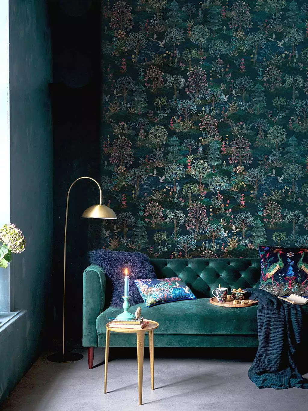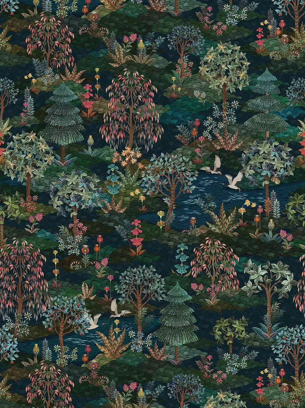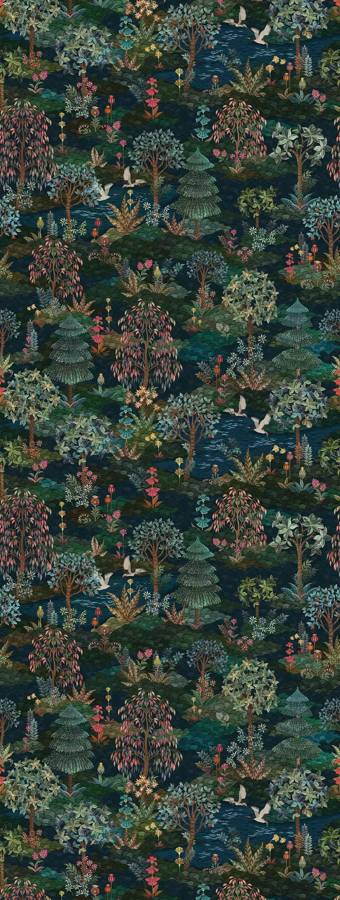Die Pip Mural Flower entführt in eine zauberhafte Fantasiewelt voller Farben und filigraner Details. Üppige Pflanzen, exotische Bäume und verspielte Blüten ranken sich über einen tiefdunklen Hintergrund, während kleine Tiere und Vögel die Szenerie zum Leben erwecken. Die detailreiche Illustration erinnert an traditionelle botanische Illustrationen und verleiht jedem Raum eine märchenhafte Tiefe. Perfekt für Akzentwände oder als kunstvolles Gesamtbild.
