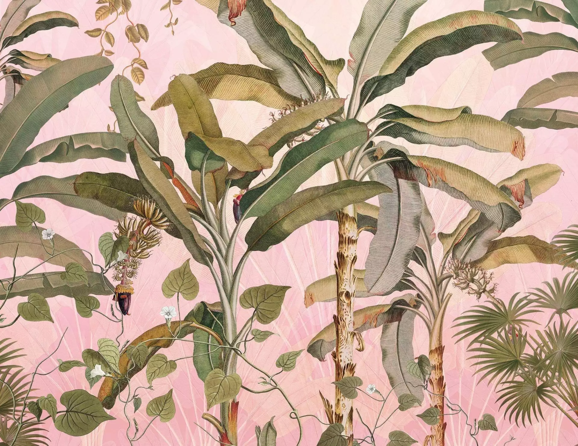 Ein detailreiches Motiv mit Bananenblättern, Ranken und tropischen Pflanzen auf sanft rosafarbenem Hintergrund. Plantation spielt mit Kontrasten zwischen natürlicher Üppigkeit und feiner Linienführung. Das Design wirkt exotisch, aber nicht aufdringlich – ein Blickfang, der Wärme und Lebendigkeit in den Raum bringt.