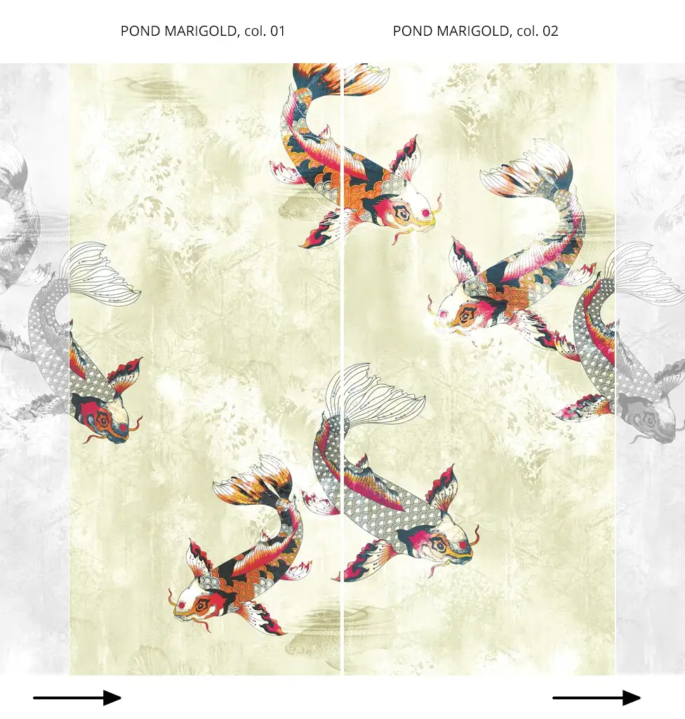 Die Tapete "POND MARIGOLD" erhalten Sie im Online-Shop der TapetenAgentur in insgesamt zwei Variationen. In den Raumbildern sind ggf. mehrere Bahnen verschiedener Artikel abgebildet (zu finden in Varianten). Die 2 Artikel/Bahnen können in der Reihenfolge: col.01 plus col.02 ... fortlaufend kombiniert werden.