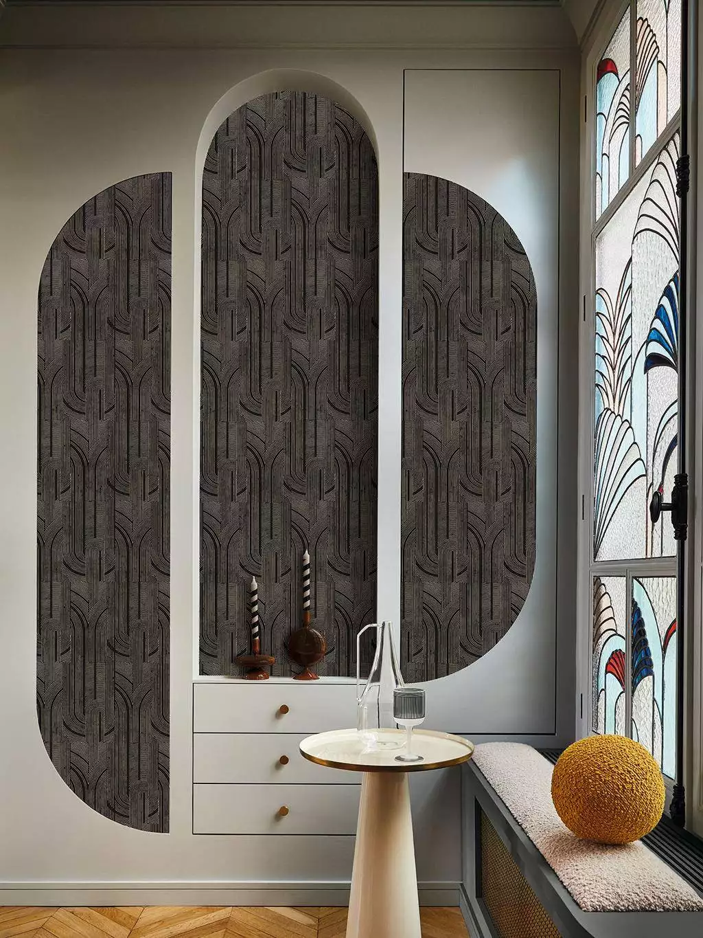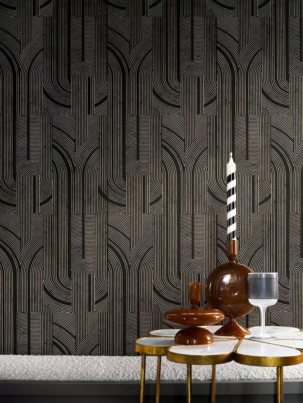 Mit Porte Dorée aus der Kollektion Faubourg des Lumières bringt Casamance majestätische Arkadenmotive im Mix aus tiefem Schwarz und metallischem Gold an die Wand. Die Tapete vereint Art-Déco-Grafik mit edlem Schimmer – ideal für Akzentwände im Wohnzimmer, Flur oder Büro. Die große Bahnbreite und das präzise Muster sorgen für visuelle Wirkung ohne Überladenheit.