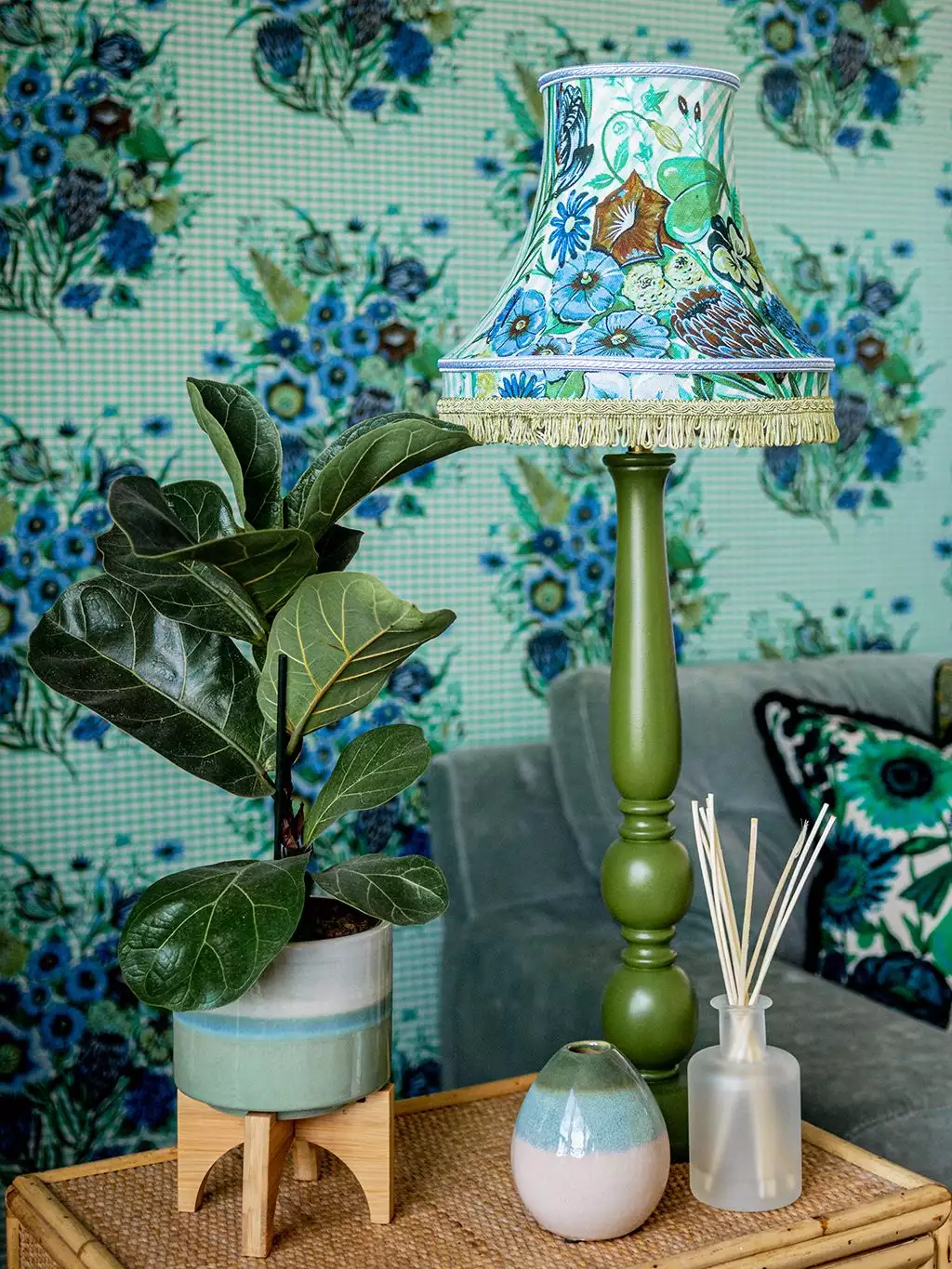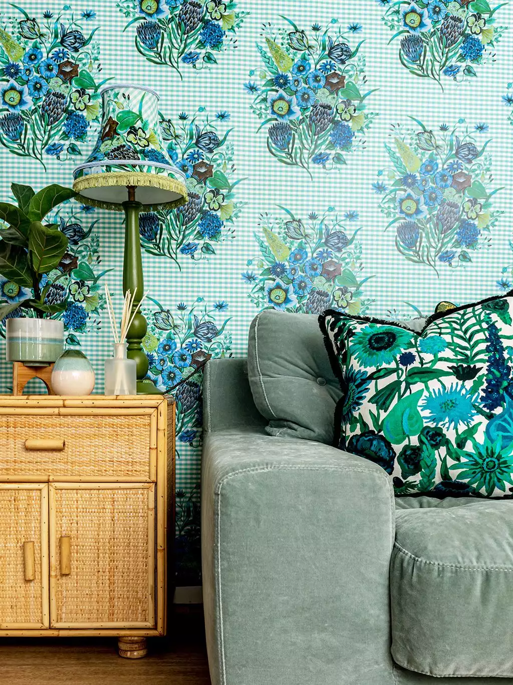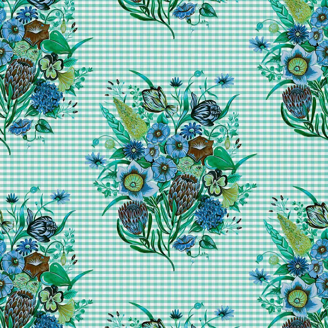 Begrüßen Sie diese wunderschönen neuen Druck, Posy im Landhausstil. Ein farbenfroher Blumenstrauß auf einem schönen traditionellen Gingham-Hintergrund. Die Farbgebung in Aqua-Blau ist wunderschön und so frisch, dass sie strahlt! Während dieses Design immer noch Vintage-Charakter hat, wird es durch die fröhliche Farbgebung einem euen Publikum zugänglich gemacht. Sie passt zu schönen, eklektischen Wohnungen, die mit Textilien, interessanten Objekten und viel Kunst gefüllt sind.
