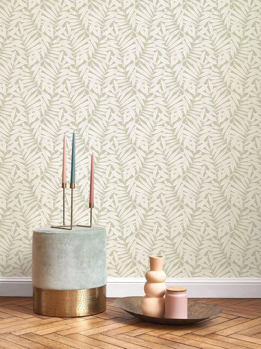 Die Tapete Preston Vert Amande lässt Licht und Stimmung aufblühen und verwandelt Wände in filigrane Erinnerungsorte der Natur. Feine Blattmotive in Creme tanzen über einen warmen, hellbraunen Fond. Die sanfte Farbgebung erinnert an natürliches Leinen und bringt Leichtigkeit und subtile Wärme ins Interieur, dazu auch Ruhe, Eleganz und eine leichte, organische Tiefe – ideal für Wohn- und Schlafbereiche.