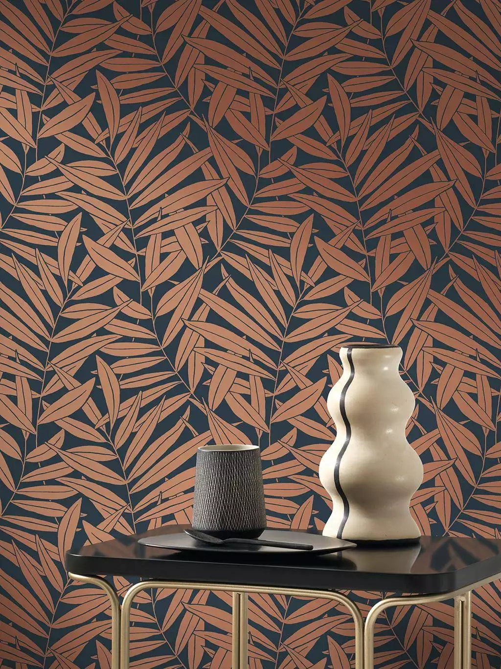 Die Tapete Preston Rouille von Casadeco bringt feinblättrige Wedel in modernem Gewand in den Raum. Zarte Blätter in erdigen Töne wirken auf dem dunklen Fornd wie ein herbstlicher Hauch und bringen organische Struktur und Tiefe an die Wand. Ideal für Wohnzimmer oder Essbereich – hier entfaltet sie ihre Stimmungskraft voll.