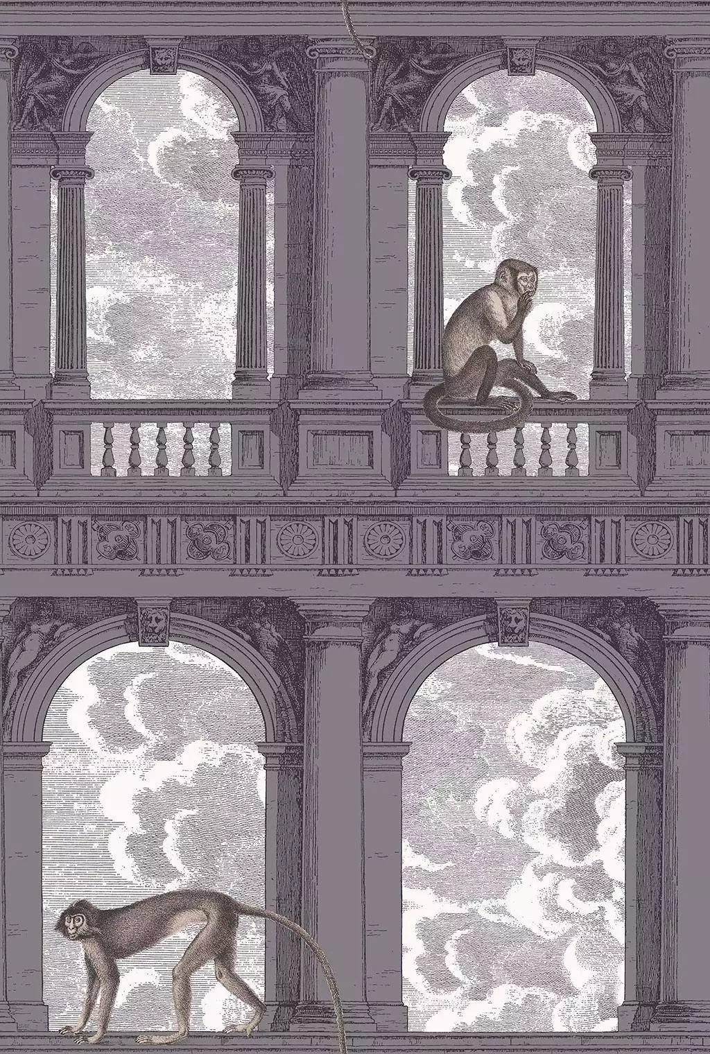 Zwischen geheimnisvoll im Dunkel liegenden Arkaden spielende Äffchen, die sich über etwas sehr zu amüsieren scheinen.