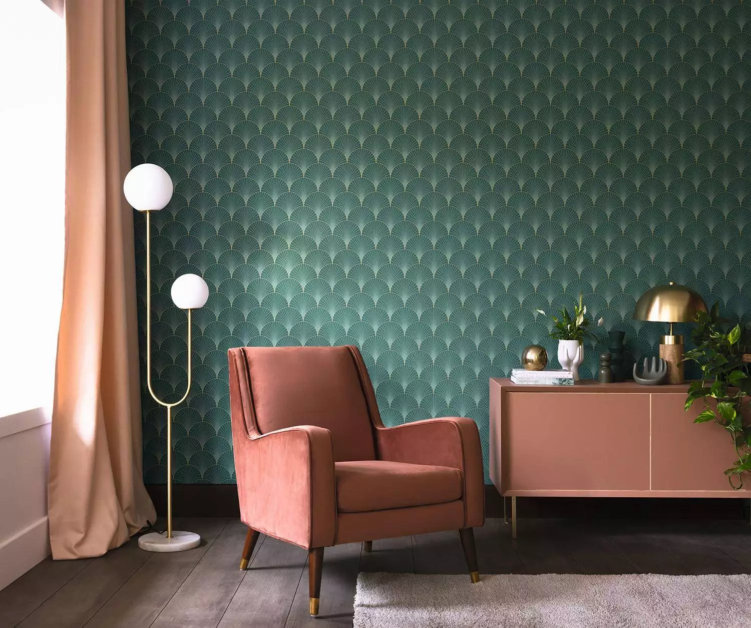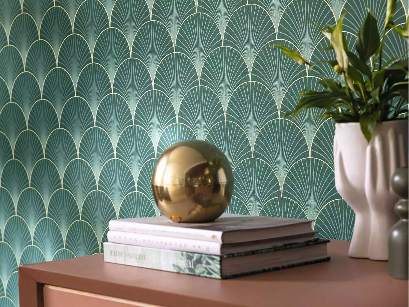 Die Tapete Prosperity verkörpert mit ihren klare Bögen und feinen Fächern die Prosperität des 20er Jahre. Wie ein Hauch aus der goldenen Ära des Art Déco entfaltet die moderne Tapete in vert emeraude dore ihre raffinierte Geometrie: Fächerformen in Smaragdgrün und feinem Gold schwingen harmonisch über die Wand und spielen mit Licht und Schatten. Ihr rhythmisches Muster wirkt ruhig und belebend – mit Stilbewusstsein und zeitloser Eleganz.