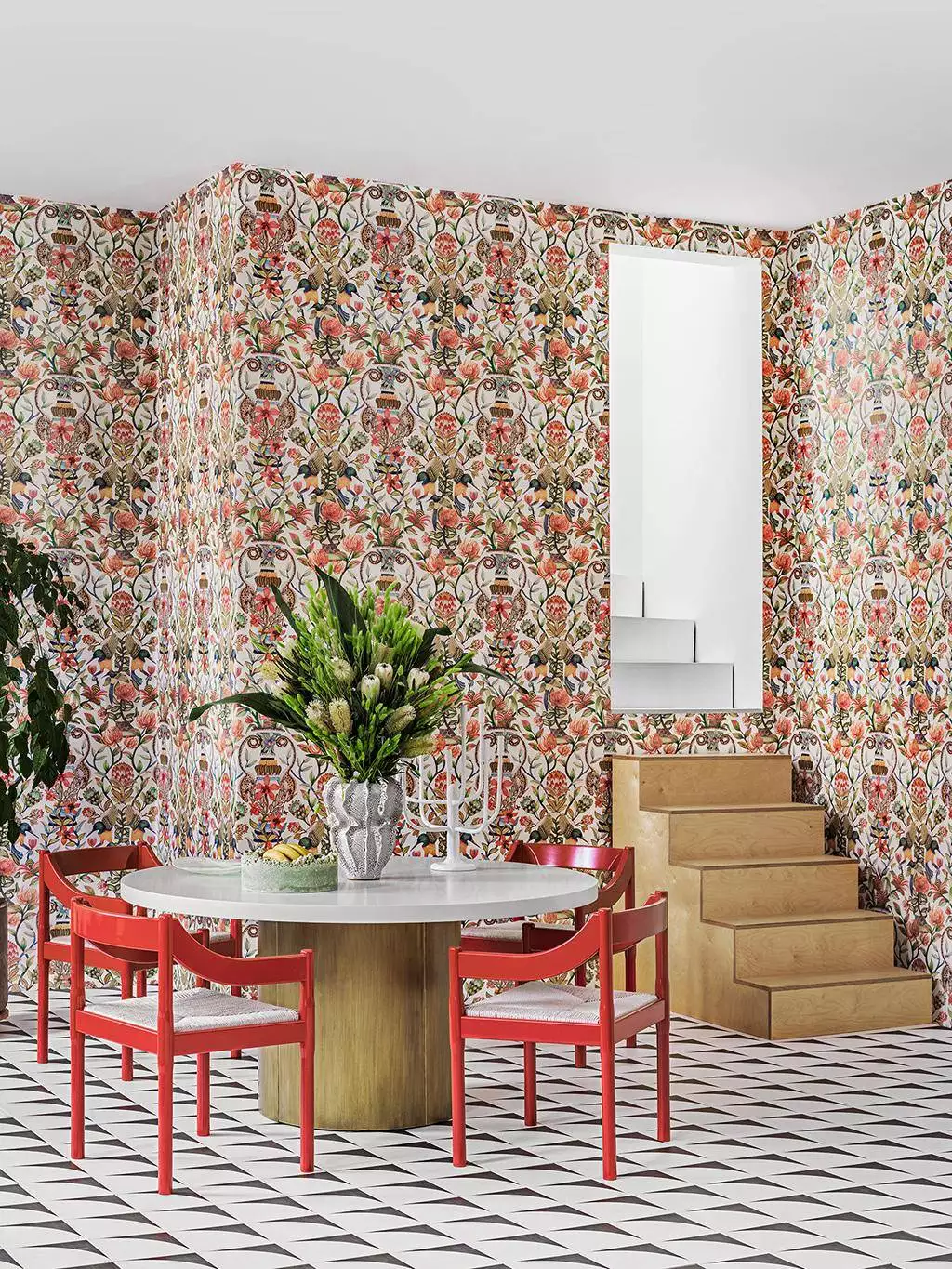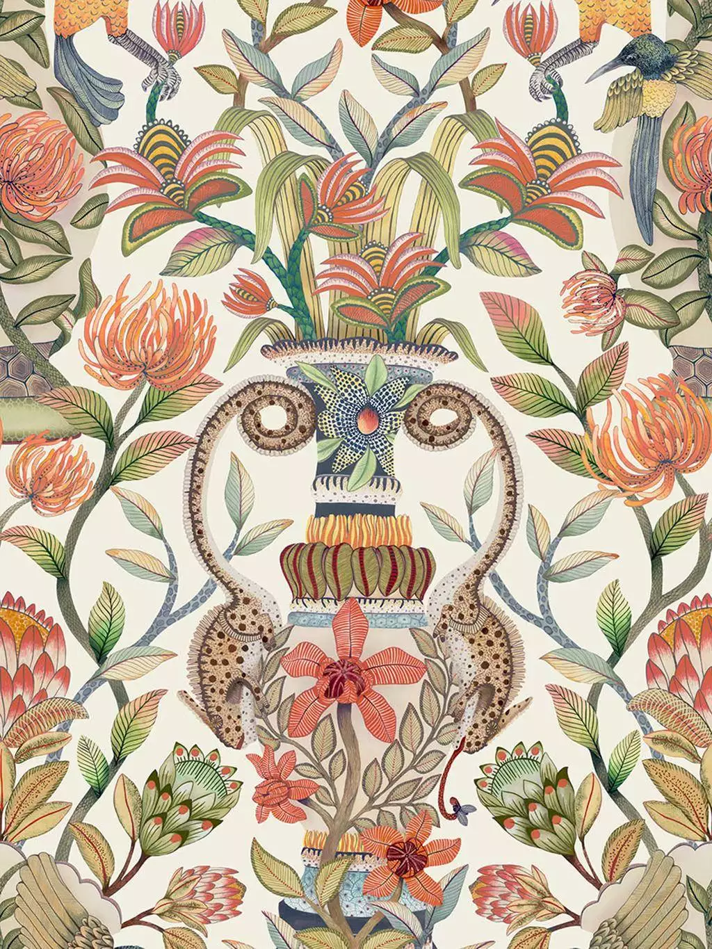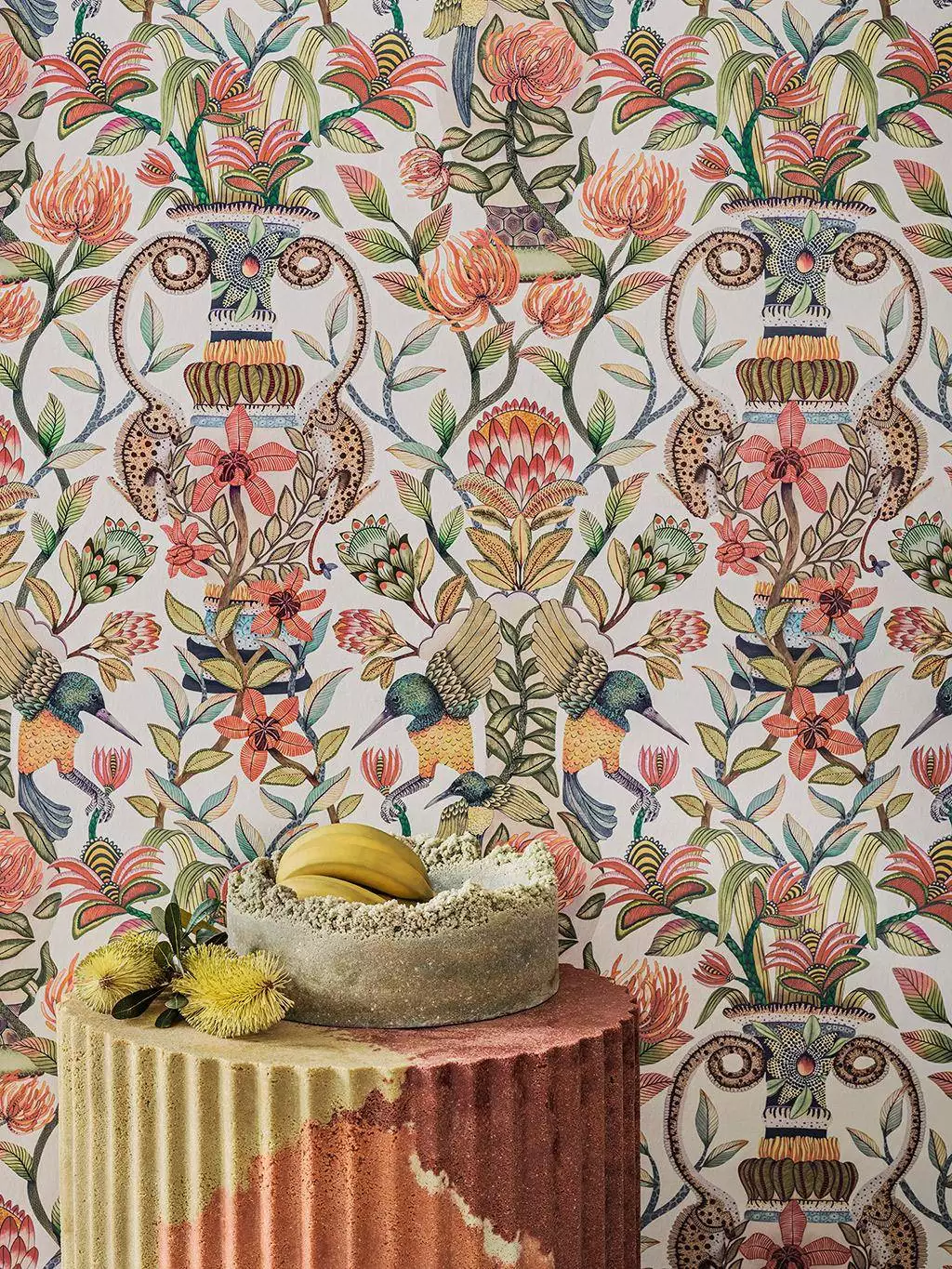 Ein weitläufiges Muster aus Blättern, Ranken und der südafrikanischen Nationalblume, der King Protea. Inspiriert von den charakteristischen Werken Ardmores, vereinen sich in Protea Garden lebendige Elemente der Natur. Sonnenvögel mit leuchtendem Gefieder ernähren sich von Nektar, während Chamäleons zwischen den geschwungenen Formen des Designs auf Beute lauern.
