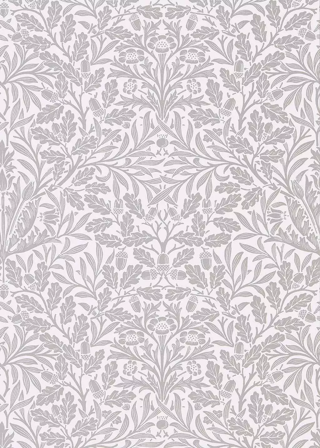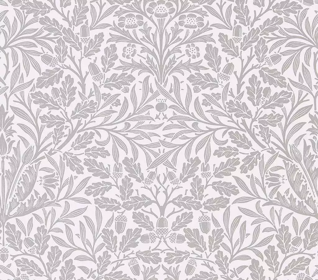 Das Design umfasst sowohl Weiden- als auch Eichenblätter und Eichelzweige. Sie sind zu einem ansprechenden Muster mit schlichtem, zweifarbigem Design in Weiß und Hellgrau arrangiert.