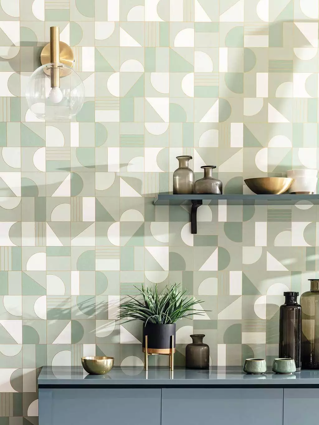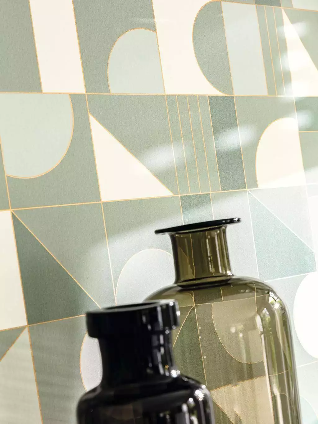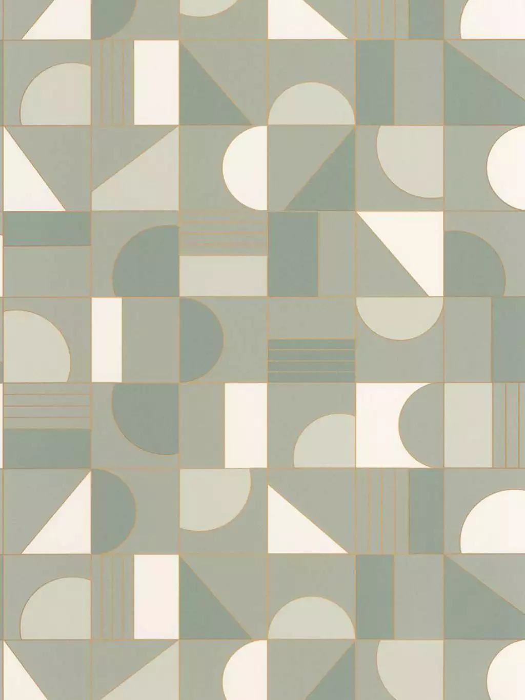 Die Tapete Puzzle Labyrinth, col. 04 setzt auf klare Geometrie: Halbkreise, Segmente und feine Linien bilden ein ruhiges, gleichmäßiges Raster und greifen typische Art-Déco-Elemente auf. Das Zusammenspiel aus hellen Grün- und Cremetönen wird durch schmale Goldkonturen präzise gefasst. Ein zurückhaltendes, dekoratives Design, das sich mühelos in moderne Wohn- und Arbeitsbereiche einordnet. Für Art Déco Fans ein fröhlicher Eyecatcher.