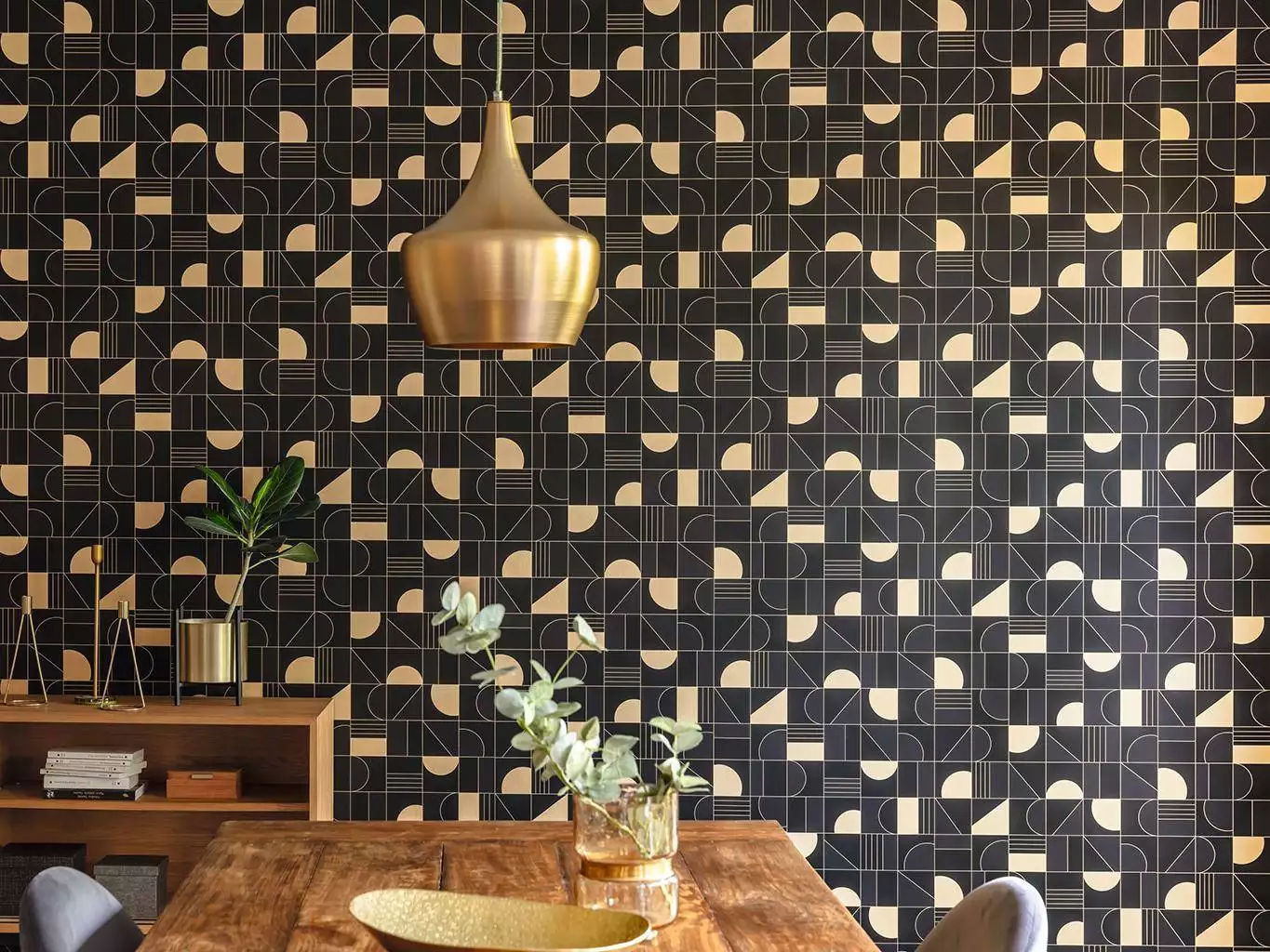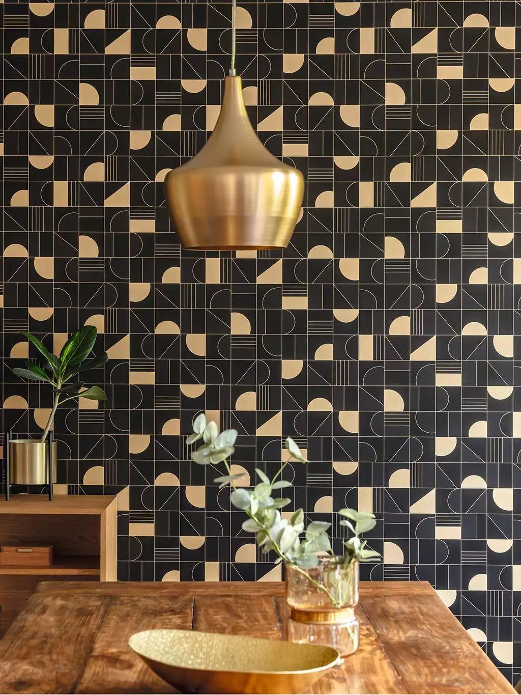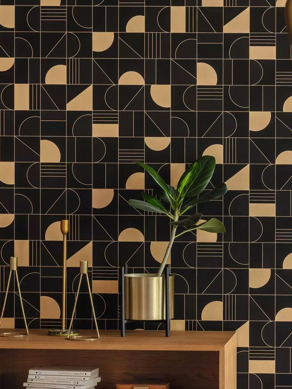 Die Tapete Puzzle Labyrinth, col. 06 zeigt, wie grafische Elemente zu einer ruhigen Ordnung finden. Das Design besteht aus einem modularen Raster aus Kreisen, Linien, Halbbögen und Diagonalen in Schwarz und Goldbraun. Jedes Segment wirkt wie ein eigenes grafisches Element, das sich zu einem komplexen Gesamtbild fügt. Die Kombination aus matten und schimmernden Flächen erzeugt subtile Tiefe. Trotz der Vielfalt im Detail bleibt die Gesamtwirkung strukturiert und klar – ideal für Räume, die moderne Präzision mit warmer grafischer Spannung verbinden.