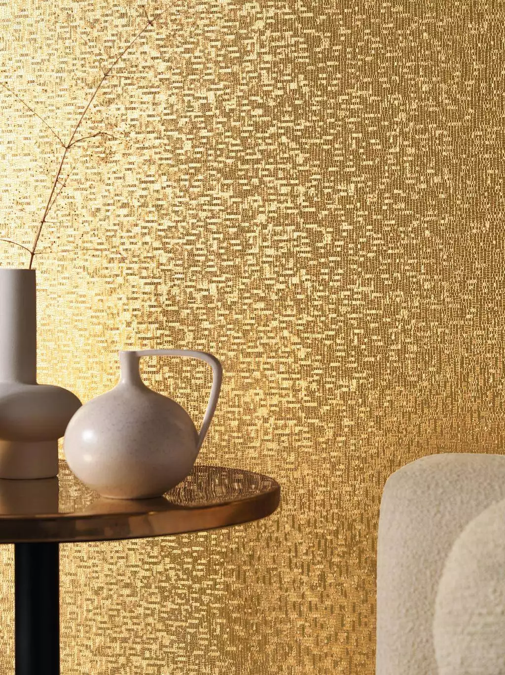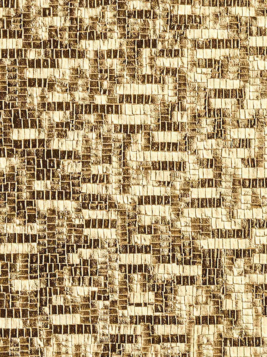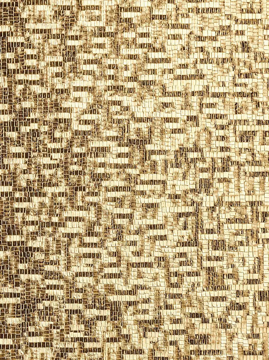 Die Oberfläche der Tapete Pyrit spielt mit dem Tessela-Ornament: Mosaikartige aneinandergesetzte Quadrate und Splitterformen wirken wie Goldpartikel, die in die Oberfläche eingearbeitet sind. Die metallischen Effekte reflektieren das Licht und sorgen für eine faszinierende Tiefenwirkung und Strahlkraft. Pyrit ist ein starkes Votum an der Wand, das jedem Raum eine ganz besondere Note und ein edles Finish verleiht.