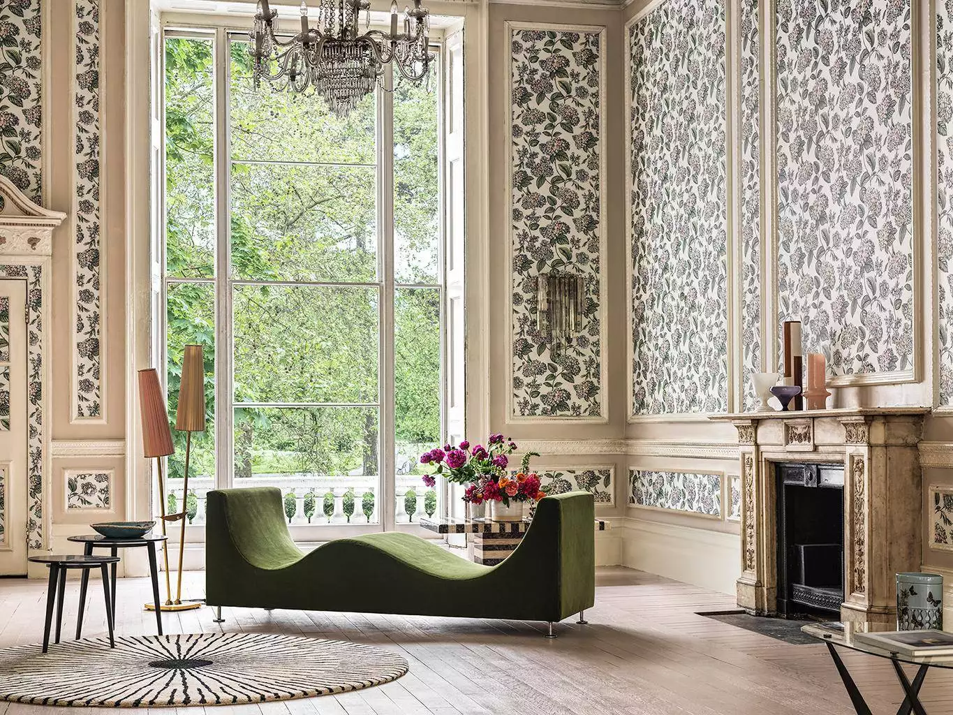 Das Design „Rami di Ortensia“ zeigt üppige Hortensienblätter und Blüten, inspiriert vom Garten des Fornasetti-Hauses in Mailand. Piero Fornasetti entwarf das Motiv in den 1950er Jahren, angeregt durch die Begeisterung seines Sohnes Barnaba für ihre Blüte. In col. 39 wirken sanften Grüntöne und feinen Pastellfarben leicht und natürlich. Die Tapete bringt eine ruhige, florale Struktur in den Raum, ohne aufdringlich zu sein. Klassisch und lebendig zugleich fängt das Muster die üppigen Blätter dieser blühenden Pflanze und ihren betörenden Sommerduft ein.