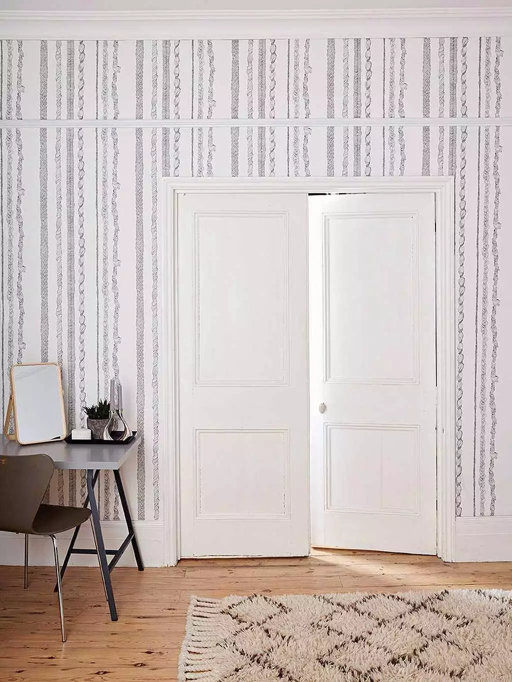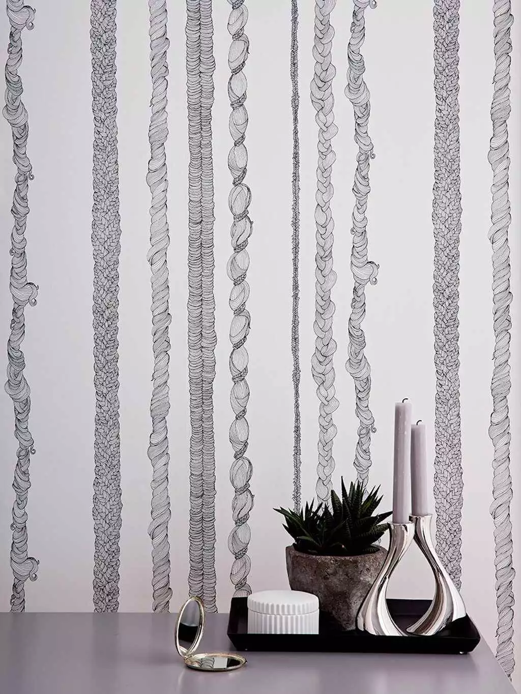 Von Ferne wirkt Rapunzel Stripe wie eine klassische, einfarbige Streifentapete. Bei näherer Betrachtung erkennt man handgezeichnete Zöpfe, die eine moderne, märchenhafte Interpretation des traditionellen Streifenmusters darstellen.