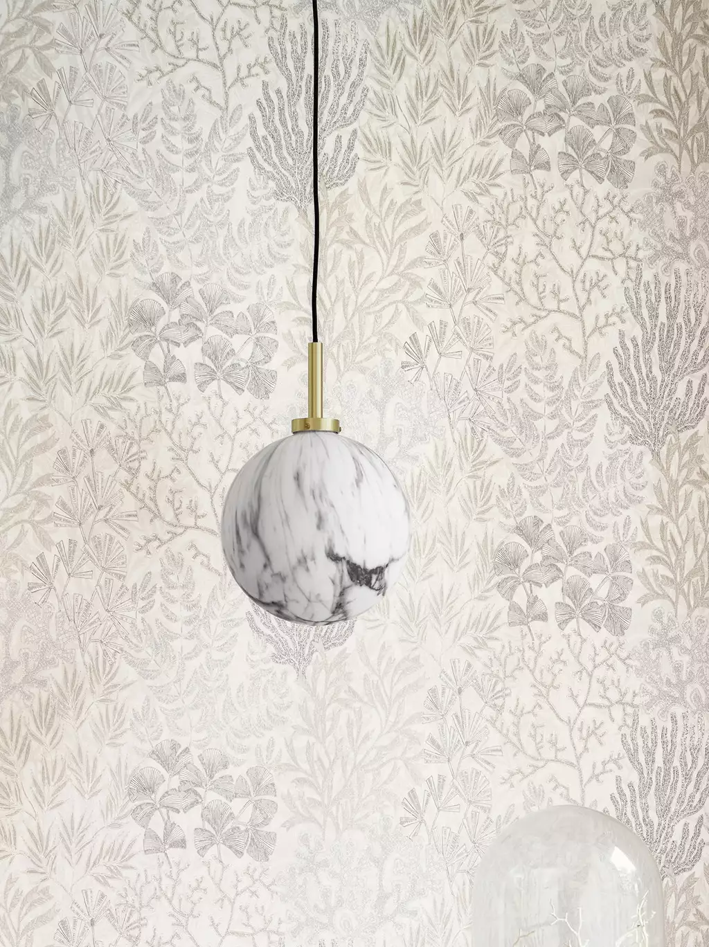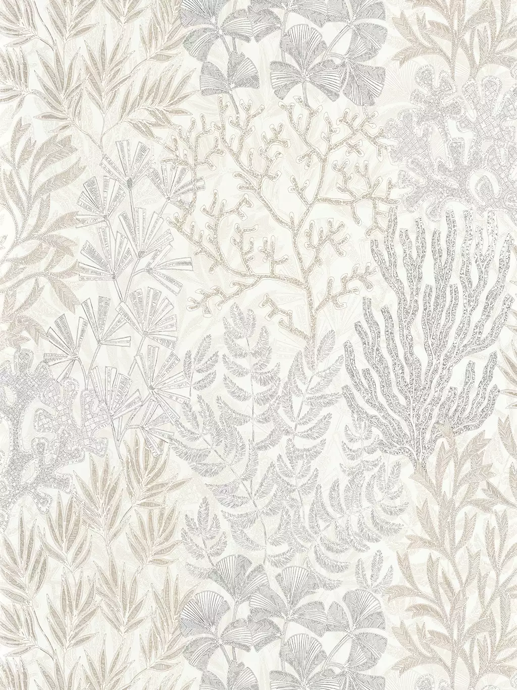 Die Tapete Recif aus dem Hause Casadeco bezaubert mit ihrer natürlichen Farbgebung und dem wunderschönen Muster aus verschlungenen Blättern aus der faszinierenden Unterwasserwelt. Auf dem cremefarbenen Untergrund aus feinstem Vlies ranken sich die Blätter an filigranen Stängeln, als Korallen und schwebende Unterwasserpflanzen die Wand entlang. Der hochwertige Druck in Silber und Gold changiert in tausenden Reflexen, wenn das Licht der Sonne oder eines grazilen Kronleuchters auf die Tapete Recif trifft.